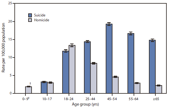 In 2009, the age-adjusted suicide rate for the total population (11.8 per 100,000 population) was approximately twice as high as the age-adjusted homicide rate (5.5). Persons aged 18–24 years had the highest rate of homicide in 2009, whereas persons aged 45–54 years had the highest rate of suicide. The suicide rate was higher than the homicide rate among those aged ≥25 years, and this difference increased with age. For persons aged 25–44 years, the rate of suicide was nearly twice the rate of homicide, whereas for those aged ≥65 years, the rate of suicide was nearly seven times the homicide rate.