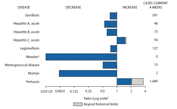 Alternate Text: The figure above shows selected notifiable disease reports for the United States, with comparison of provisional 4-week totals August 4, 2012, with historical data. Reports of acute hepatitis C, and pertussis increased, with both increasing beyond historical limits Reports of giardiasis, acute hepatitis A, acute hepatitis B, legionellosis, measles, meningococcal disease, and mumps all decreased.