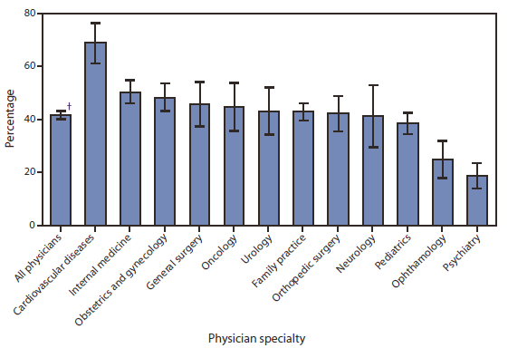 An estimated 42% of all physicians have an EHR system that meets federal standards. Ophthalmologists (25%) and psychiatrists (19%) were least likely, and cardiovascular diseases specialists (69%) were most likely to use a federally approved system.