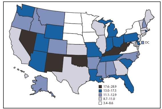 In 2010, age-adjusted drug poisoning death rates varied by state, ranging from 3.4 to 28.9 per 100,000 standard population. The rate for the United States was 12.3. The five states with the highest rates were Oklahoma (19.4), Nevada (20.7), Kentucky (23.6), New Mexico (23.8), and West Virginia (28.9).