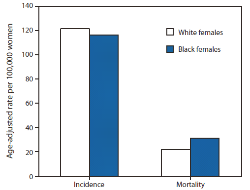 † The ratio of breast cancer incidence rates among black females compared with breast cancer incidence rates among white females was 0.96. The ratio of breast cancer mortality rates among black females compared with breast cancer mortality rates among white females was 1.41.