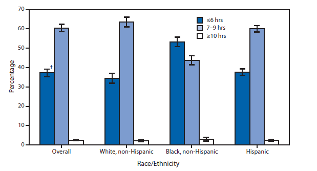 During 2007–2010, 60.4% of U.S. adults aged ≥20 years slept 7–9 hours at night, 37.3% slept 6 hours or less, and 2.3% slept 10 hours or more. Non-Hispanic black adults were less likely to report sleeping 7–9 hours and more likely to report sleeping 6 hours or less than non-Hispanic white and Hispanic adults.