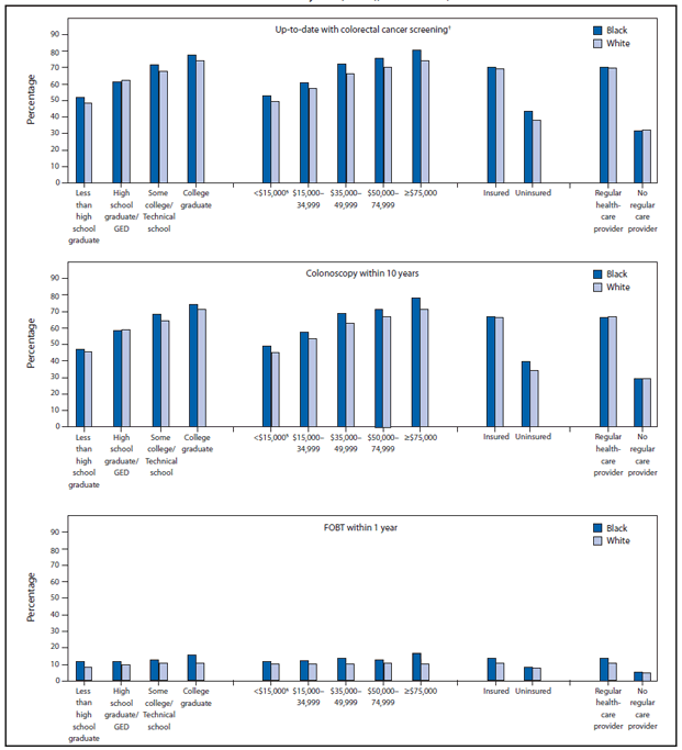 Among respondents who were up-to-date with CRC screening, colonoscopy was the most commonly used test (61.7%), followed by FOBT (10.4%), and sigmoidoscopy in combination with FOBT (0.7%) (Table 2). The percentage reporting use of either FOBT or colonoscopy increased with age and was greater among those with health insurance and those with a regular health-care provider. Compared with other racial groups, a greater percentage of whites (62.7%) and blacks (62.1%) reported colonoscopy within 10 years, and a greater percentage of Asian/Pacific Islanders (14.5%) and blacks (12.6%) reported FOBT within 1 year. Minimal variation in reported FOBT use by education level and household income was observed, whereas the percentage of respondents reporting colonoscopy within the last 10 years increased with greater education level and annual household income. Among blacks and whites, a greater percentage of blacks reported receiving an FOBT within 1 year regardless of income or education level (Figure).