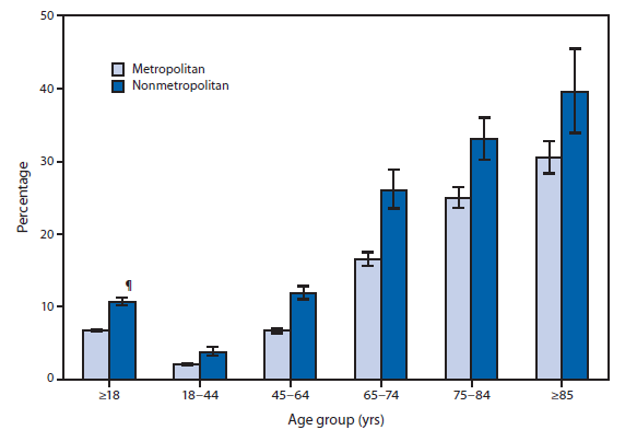 During 2010–2012, the percentage of adults aged ≥18 years who had no natural teeth was higher in nonmetropolitan areas than in metropolitan areas for all age groups. The percentage of adults with no natural teeth also increased steadily with age in metropolitan and nonmetropolitan locations. Among persons aged ≥85 years in nonmetropolitan locations, 40% had lost all their natural teeth, compared with 31% of those in metropolitan areas. Among adults aged 18–44 years, the percentages were 3.8% in nonmetropolitan areas and 2.1% in metropolitan areas.