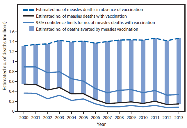 WHO has developed a model to estimate measles mortality in member states using numbers and age distribution of reported cases, routine and SIA MCV coverage, and age-specific, country-specific case-fatality ratios (3,4). New measles vaccination coverage and case data for all member states during 2000–2013 led to a new series of mortality estimates. During this period, estimated measles deaths decreased 75%, from 544,200 to 145,700, and all regions had substantial reductions in estimated measles mortality (Table 1). Compared with no measles vaccination, an estimated 15.6 million deaths were prevented by measles vaccination during 2000–2013 (Figure).