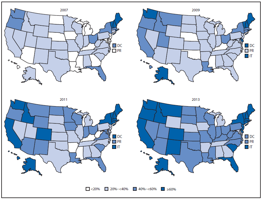 Alternate Text: The figure above contain four maps of the United States showing the percentage of U.S. hospitals implementing more than half of the Ten Steps to Successful Breastfeeding, by state or jurisdiction, in 2007, 2009, 2011, and 2013.