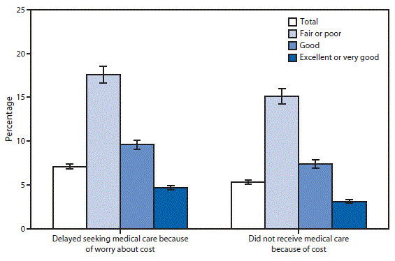 Based on 2014 data, approximately 7% of persons (22.3 million) in the United States delayed medical care during the preceding year because of worry about the cost, and 5% (16.5 million) did not receive needed medical care because they could not afford it. Persons whose health was assessed as fair or poor were nearly four to five times as likely as persons whose health was excellent or very good to delay care (17.6% versus 4.7%) or not receive needed medical care (15.1% versus 3.1%) because of cost.