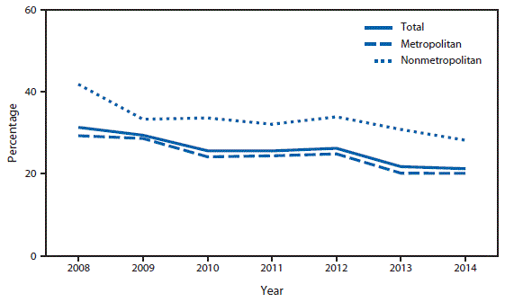 Alternate Text: The figure above is a line chart showing that from 2008 to 2014, the percentage of youths aged 10-17 years who had not received a well-child checkup in the past 12 months decreased overall (31.3% to 21.2%) and in both metropolitan (29.3% to 20.1%) and nonmetropolitan (41.8% to 28.2%) areas. In 2014, youths aged 10-17 years residing in nonmetropolitan areas were more likely to have not received a well-child checkup in the past 12 months compared with those residing in metropolitan areas.