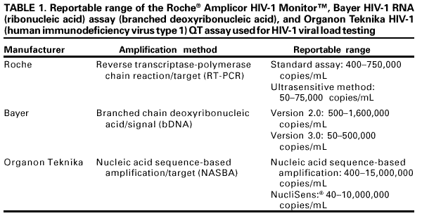 DISCUSSIONAlthough results from laboratories that use the three commercially produced assays are strongly correlated, the absolute values of HIV viral load measured in the same plasma sample by using two different assays can differ by >2-fold. Data from the MPEP performance surveys demonstrate these differences and illustrate the need for continued surveillance of manufactured tests and laboratory performance. Until a common standard is available to use for normalizing values obtained with different assay methods, choosing one assay method is advisable when HIV RNA levels are monitored to guide therapeutic decision-making. The goal to develop a common standard for normalizing values obtained with different test kits has recently been reported (41). In that study, 26 laboratories, representing 10 different countries, collaborated in establishing the first international standard for HIV-1 RNA that can be used for nucleic acid-based techniques. According to the SDSU survey of laboratory practices, <50% of the laboratories indicated on the results slip what test had been used. Because this information is used to interpret results, whether for clinical care or public health purposes, assay methods and test kit manufacturers should be noted on all viral load test reports. SDSU's survey indicated that all laboratories reported results in copies/mL, and certain laboratories also provided log10 transformation. Although changes can be monitored by using either absolute or log10 values, absolute values are used to determine therapy initiation. In addition, results expressed in both copies/mL and log10 might be useful to health-care providers; therefore, reporting both is strongly recommended. Available tests are not licensed for diagnosing HIV infection, but the viral load test results are used for reporting HIV infection to local and state health departments (34). Although future versions of these tests might be licensed for diagnostic purposes, health-care providers should be aware that available viral load tests are only useful for monitoring clinical status after an HIV diagnosis (35). Available test kits perform differently in detecting non-B subtypes (42--48). In the United States, the Roche Amplicor HIV-1 Monitor version 1.0 is the most popular test for determining viral load. However, it underdetects and underestimates non-B subtypes (e.g., A, E, F, and G) when quantifying viral load (42--47). The Bayer HIV-1 RNA 3.0 Quantitative Assay (bDNA) probably quantifies RNA of different HIV-1 subtypes accurately as a result of redundancy of multiple probes (43--45). The Organon Teknika NucliSens HIV-1 QT assay also underdetects and underestimates divergent subtypes (e.g., A and E) (43--45). All assays have problems amplifying HIV-1 group O and do not amplify HIV-2. The Roche Monitor version 1.5 kit uses a new set of probes and primers that reportedly detect and quantitate non-B subtypes with greater efficiency than the previous version (42--46). Plasma HIV RNA level provides a valid measure of antiretroviral therapy efficacy for HIV-infected persons. Antiretroviral therapy suppression of HIV RNA level followed by rebound levels might signal the emergence of drug-resistant HIV variants, suboptimal adherence to the antiretroviral therapy regimen, decreased absorption of antiretroviral drugs, altered drug metabolism because of physiologic changes, drug interactions, vaccinations, or concurrent infections. An HIV RNA level might be transiently elevated among patients on therapy; the consequences of such elevations is unknown. HIV RNA levels can vary by approximately threefold (0.5 log10) in either direction upon repeated measurements among clinically stable, HIV-infected persons. Changes >0.5 log10 usually cannot be explained by inherent biological or assay variability and likely reflect a biologically and clinically relevant change in the level of plasma HIV RNA. However, plasma HIV RNA assays vary greater toward the lower limits of sensitivity. Thus, differences between repeated measures of >0.5 log10 might occur at low plasma HIV RNA values and might not reflect a substantive biological or clinical change. Viral load reporting has implications for clinical care and HIV/AIDS surveillance. State public health programs are implementing recommendations by the Council of State and Territorial Epidemiologists and CDC for nationwide HIV surveillance, including reporting detectable RNA viral loads (34). As part of this reporting, laboratories and health-care providers would be required to report HIV-infection cases to state and territorial health departments. Standard methods are needed for viral load test reporting to providers and health departments so that clinicians and public health professionals will have a common language to use in conducting patient care and monitoring the epidemic. To facilitate developing that common language, CDC and the Council of State and Territorial Epidemiologists recommend that all states adopt rules or regulations to require reporting of detectable viral loads to public health departments. One state requires reporting of undetectable viral load results based on the lower limit sensitivities of the manufactured kits, but then follows up with health-care providers to document whether the patient has other test results or clinical evidence indicative of infection with HIV. Reporting of viral load test results by using standard nomenclature, test results presentation, and electronic data transfer will permit reporting of HIV cases in a way that is compatible with electronic laboratory efforts being developed for national notifiable disease reporting (49). References