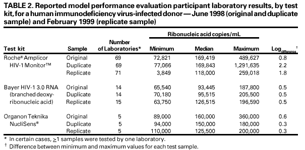 *The conference report can be ordered from APHL at Internet: <http://www.aphl.org> (accessed July 19, 2001) **Certain enzyme immunoassay (EIA or enzyme-linked immunosorbent assay [ELISA]) screening and Western blot confirmatory tests used in the United States reliably detect HIV-1 infection but not HIV-2 infection. HIV infections acquired in Africa, specifically West Africa, might be HIV-2 infection and escape detection if assays optimized for HIV-1 are used. Health-care providers who perform HIV tests on patients who might have been exposed in Africa (e.g., returning visitors or newly arriving immigrants and refugees) should use EIAs that are licensed for detection of both HIV-1 and HIV-2. Additionally, the majority of commercially available tests that are used to detect HIV RNA viral load are effective for HIV-1 subtype B but not other HIV-1 subtypes (e.g., A, C, D, or E). No FDA-approved tests for quantification of non-B HIV subtypes exist. HIV infections acquired outside the United States might be HIV-1 non-B subtypes. Therefore, when testing patients for viral load who might have been exposed in Africa or other overseas locations, assays that are effective for multiple HIV-1 subtypes (HIV-2 RNA viral load tests are not commercially available) should be used. ***Samples are obtained from individual donors; samples from different donors are not pooled, and individual samples are not diluted. ****Good reproducibility can be defined as acceptable testing performance of duplicate and replicate samples influencing the quality of precision and accuracy (Sources: Taylor JK. Principles of quality assurance of chemical measurements. Gaithersburg, MD: US Department of Commerce, National Bureau of Standards, 1985; publication no. NBSIR 85-3105; and Taylor JK. Quality assurance of chemical measurements. Anal Chem 1981;53:1588A). *****Good laboratory practice is defined as an acceptable way to perform a basic activity that is known to influence the quality of its output (Source: Taylor JK. Good laboratory and good measurement practices. In: Quality assurance of chemical measurements. Chelsea, MI: Lewis Publishers, Inc., 1987;112--3.) Table 1 ![]() Return to top. Table 2 ![]() Return to top.