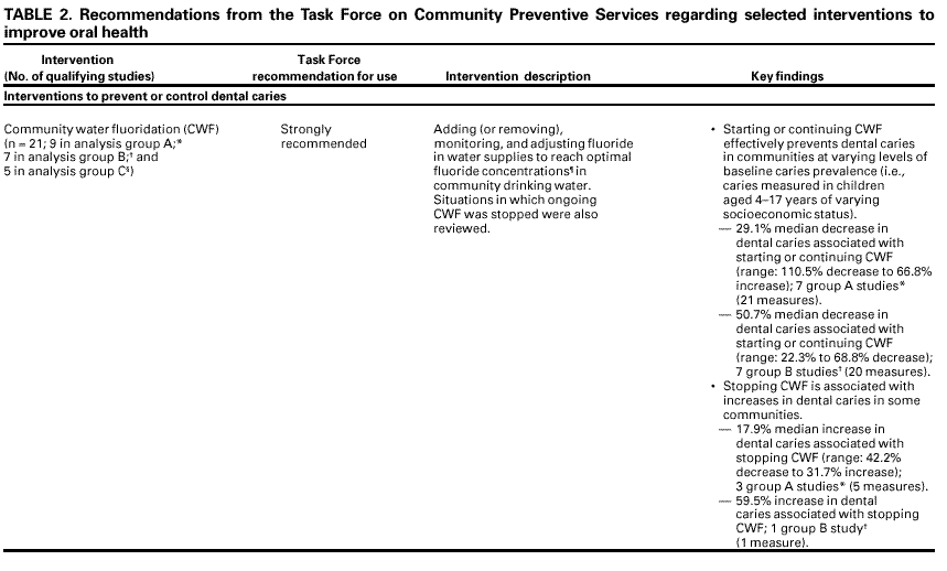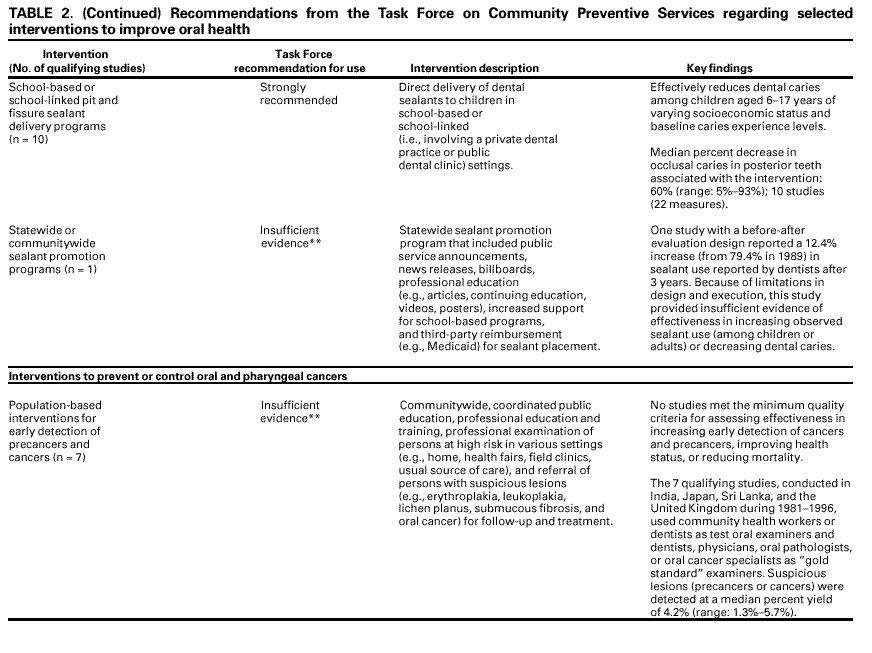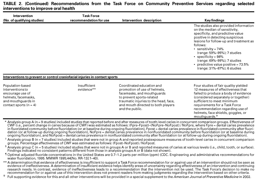 Persons using assistive technology might not be able to fully access information in this file. For assistance, please send e-mail to: mmwrq@cdc.gov. Type 508 Accommodation and the title of the report in the subject line of e-mail. Promoting Oral Health: Interventions for Preventing Dental Caries, Oral and Pharyngeal Cancers, and Sports-Related Craniofacial InjuriesA Report on Recommendations of the Task Force on Community Preventive ServicesCHAIR Jonathan E. Fielding, M.D., M.P.H., M.B.A. VICE-CHAIR Patricia Dolan Mullen, Dr.P.H. Ross C. Brownson, Ph.D. Mindy Thompson Fullilove, M.D. Fernando A. Guerra, M.D., M.P.H. Alan R. Hinman, M.D., M.P.H. George J. Isham, M.D. Garland H. Land, M.P.H. MEMBERS Charles S. Mahan, M.D. Patricia A. Nolan, M.D., M.P.H. Susan C. Scrimshaw, Ph.D. Steven M. Teutsch, M.D., M.P.H. Robert S. Thompson, M.D. CONSULTANTS Robert S. Lawrence, M.D. J. Michael McGinnis, M.D. Lloyd F. Novick, M.D., M.P.H. FORMER MEMBERS Patricia A. Buffler, Ph.D., M.P.H. Mary Jane England, M.D.* Caswell A. Evans, Jr., D.D.S., M.P.H.* David W. Fleming, M.D.* The following CDC staff members prepared this report: Benedict I. Truman, M.D., M.P.H. Barbara F. Gooch, D.M.D., M.P.H. Iddrisu Sulemana, M.P.H., M.A. in collaboration with Alice M. Horowitz, Ph.D. Helen C. Gift, Ph.D. Caswell A. Evans, Jr., D.D.S., M.P.H.* SummaryThe Task Force on Community Preventive Services (the Task Force) has conducted systematic reviews of the evidence of effectiveness of selected population-based interventions to prevent and control dental caries (tooth decay), oral (mouth) and pharyngeal (throat) cancers, and sportsrelated craniofacial injuries. The Task Force strongly recommends community water fluoridation and schoolbased or schoollinked pit and fissure sealant delivery programs for prevention and control of dental caries. Using the rules of evidence it has established, the Task Force found insufficient evidence of effectiveness or ineffectiveness of the remaining interventions reviewed. Therefore, the Task Force makes no recommendation for or against use of statewide or communitywide sealant promotion programs, populationbased interventions for early detection of precancers and cancers, or populationbased interventions to encourage use of helmets, facemasks, and mouthguards to reduce oral-facial trauma in contact sports. The Task Force's finding of insufficient evidence indicates the need for more research on intervention effectiveness. Until the results of such research become available, readers are encouraged to judge the usefulness of these interventions by other criteria. This report presents additional information regarding the recommendations, briefly describes how the reviews were conducted, and provides information designed to help apply the strongly recommended interventions locally. BACKGROUNDDespite substantial improvements in oral health for most persons living in the United States during the 20th century, the nation spends an estimated $60 billion annually on dental services (1), including approximately 500 million visits to dental offices (2). In 1996, estimated inpatient hospital charges for diseases of the mouth and disorders of the teeth and jaw were $451 million (3). Dental caries, oral cancers, and sports-related craniofacial injuries are potentially preventable conditions. The financial and human costs associated with these conditions, including mortality, indicate the need for interventions that promote oral health and prevent disease for all persons, regardless of age, throughout their life span. The prevalence of dental caries (i.e., the percentage of persons with >1 decayed, missing, or filled teeth) in permanent teeth increases with age, from 26% among persons aged 5--11 years to 67% among persons aged 12--17 years and 94% for dentate adults (with >1 natural teeth) aged >18 years (4,5). The prevalence of dental caries among children aged 12--17 years has declined from 90% during 1971--1974 to 67% during 1988--1991. Severity (i.e., the mean number of decayed, missing, or filled teeth) has declined from 6.2 to 2.8 during this period (4,6). Eighty percent of dental caries identified in permanent teeth of children aged 5--17 years in the United States occur in 25% of children (4,6,7). Lower-income, Mexican-American, and African-American children and adults have more untreated decayed teeth than their higher-income or non-Hispanic white counterparts (4,5,8,9). Among lowincome children, approximately one third have untreated caries in primary teeth that could be associated with pain, difficulty in eating, and underweight (9). Dental caries on smooth tooth surfaces (those without pits and fissures) also has decreased markedly. Recent data indicate that approximately 90% of caries in permanent teeth of children occur in tooth surfaces with pits and fissures, and approximately two thirds are on the chewing surfaces alone (4,7,10). Each year, oral (mouth) and pharyngeal (throat) cancers, which are mainly squamous cell carcinomas, are diagnosed in approximately 30,000 U.S. residents, and approximately 8,000 persons die of these diseases (7,11,12). Oral and pharyngeal cancers are the fourth, seventh, and fourteenth most common cancers among African-American men, white men, and all women, respectively (11). They are most often diagnosed at late stages and treated by methods (e.g., surgery, radiation, and chemotherapy) that can be disfiguring and costly (13). Overall relative 5year survival rates are approximately 54%, and mortality is nearly twice as high among certain minorities (especially African-American men) as among whites (11,12). Epidemiologic studies indicate that approximately one third of all dental injuries and approximately 19% of head and face injuries are sports-related (7,8,14--16). During 1997--1998, persons aged 5--24 years accounted for 2.6 million (70%) of the 3.7 million emergency department visits per year for sports-related injuries among persons of all ages. Approximat