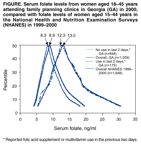 Persons using assistive technology might not be able to fully access information in this file. For assistance, please send e-mail to: mmwrq@cdc.gov. Type 508 Accommodation and the title of the report in the subject line of e-mail. Serum Folate Levels Among Women Attending Family Planning Clinics --- Georgia, 2000Prepared by SummarySince 1998, serum folate levels have increased nationally after mandatory fortification of cereal grain products with folic acid. Whether serum folate levels have increased among all women has not been well-studied. Identifying characteristics of women with lower serum folate levels would also be helpful in designing educational campaigns. Data for this report were collected during January 2000--January 2001. During 2000, blood samples were collected from 1,059 women aged 18--45 years who attended six family planning clinics in Georgia and analyzed for serum folate levels. This sample included women aged 18--25 years (60%), black women (41%), and women who had a high school education or less (49%). The median serum folate level (8.9 ng/mL) among this population was lower than the median of women of childbearing age (13.0 ng/mL) who participated in the 1999--2000 National Health and Nutrition Examination Survey (NHANES). In logistic regression analysis, women who were black (odds ratio [OR] = 2.4; 95% confidence interval [CI] = 1.48, 3.96), who smoked (OR = 2.1; 95% CI = 1.26, 3.43), or who used Depo-Provera® contraceptive injection (manufactured by Pharmacia Corporation, Peapack, New Jersey) (OR = 2.3; 95% CI = 1.15, 4.62) were more likely to be ranked in the lowest quartile (<6.2 ng/mL) of serum folate concentrations when compared with the highest quartile (>12.4 ng/mL). Women who consumed cereal regularly (OR = 0.4; 95% CI = 0.26, 0.62) or folic acid supplements (OR = 0.2; 95% CI = 0.09, 0.30) were the least likely to be in the lowest serum folate quartile. This study indicates that certain women are at greater risk for having lower serum folate levels, including women who are black, smokers, Depo-Provera users, and those less likely to eat cereal regularly or to take folic acid supplements. In Georgia, these data are useful in defining target populations (e.g., black women and smokers) for folic acid education campaigns because public health officials can develop contextually appropriate messages and outreach approaches for targeting women for folic acid interventions. Ongoing surveillance of serum folate status among women can guide future intervention efforts. IntroductionNeural tube defects (NTDs), which are serious birth defects of the brain and spinal cord, affect approximately 4,000 pregnancies each year in the United States (1). Epidemiologic studies demonstrate that folic acid, when taken in adequate amounts periconceptionally, can prevent 50%--70% of NTDs (2). During 1992, the U.S. Public Health Service (USPHS) recommended that all women of childbearing age take 400 µg of folic acid to help prevent neural tube defects (2). During 1996, as a way to increase consumption of folic acid among women of childbearing age, the Food and Drug Administration mandated that, effective January 1998, synthetic folic acid be added to enriched cereal grain products (3). Reports from the 1999 National Health and Nutrition Examination Survey (NHANES) demonstrates that serum folate levels among childbearing age women have increased after fortification. Median serum folate levels increased from 5.2 ng/mL in NHANES III (1991--1994) to 13.0 ng/mL in NHANES 1999--2000 for women aged 15--44 years (4). Whether serum folate levels have risen equally among all women is not yet known. Certain women might still be at an increased risk for having a pregnancy affected by an NTD as a result of inadequate folic acid intake. Serum folate data from subpopulations of women seeking routine clinical services would be helpful in assessing