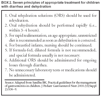 Management of Acute Gastroenteritis Among Children External: Richard Cash, M.D., Harvard School of Public Health, Boston, Massachusetts; Olivier Fontaine, M.D., World Health Organization, Geneva, Switzerland; William B. Greenough, III, M.D., Johns Hopkins University, Baltimore, Maryland; Ronald E. Kleinman, M.D., Harvard Medical School, Boston, Massachusetts; Myron (Mike) Levine, M.D., University of Maryland, Baltimore, Maryland; David R. Nalin, M.D., West Chester, Pennsylvania; Margaret B. Rennels, M.D., Center for Vaccine Development, Baltimore, Maryland; Mathuram Santosham, M.D, Johns Hopkins Bloomberg School of Public Health, Baltimore, Maryland; and John Snyder, M.D., University of California Medical Center, San Francisco, California. CDC: James M. Hughes, M.D., and Steve Ostroff, M.D., Office of the Director, National Center for Infectious Diseases (NCID); Caryn Bern, M.D., Division of Parasitic Diseases, NCID; Eric Mintz, M.D., Division of Bacterial and Mycotic Diseases, NCID; Larry Pickering, M.D., Office of the Director, National Immunization Program; and Larry Anderson, M.D., James LeDuc, Ph.D., and Umesh Parashar, M.B.B.S., Division of Viral and Rickettsial Diseases, NCID. Table 1 ![]() Return to top. Box 1 ![]() Return to top. Table 2 ![]() Return to top. Box 2 ![]() Return to top. Table 3 ![]() Return to top. Figure ![]() Return to top.