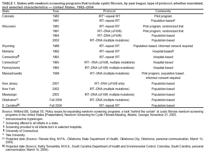 Persons using assistive technology might not be able to fully access information in this file. For assistance, please send e-mail to: mmwrq@cdc.gov. Type 508 Accommodation and the title of the report in the subject line of e-mail. Newborn Screening for Cystic FibrosisEvaluation of Benefits and Risks and Recommendations for State Newborn Screening ProgramsPrepared by Corresponding preparer: Scott D. Grosse, Ph.D., Senior Health Economist, Office of the Director, CDC/NCBDDD, 1600 Clifton Rd., NE, MS E-87, Atlanta, GA 30333; Telephone: 404-498-3074; Fax: 404-498-3070; E-mail: sgrosse@cdc.gov. Summary In November 2003, CDC and the Cystic Fibrosis Foundation cosponsored a workshop to review the benefits and risks associated with newborn screening for cystic fibrosis (CF). This report describes new research findings and outlines the recommendations of the workshop. The peer-reviewed evidence presented at the workshop supports the clinical utility of newborn screening for CF. Demonstrated long-term benefits from early nutritional treatment as a result of newborn screening for CF include improved growth and, in one study, cognitive development. Other benefits might include reduced hospitalizations and improved survival. Mixed evidence has been reported for pulmonary outcomes. Newborn screening in the United States is associated with diagnosis of CF a median of 1 year earlier than symptomatic detection, which might reduce the expense and anxiety associated with work-up for failure to thrive or other symptoms. Certain psychosocial risks for carrier children and their families (e.g., anxiety and misunderstanding) are associated with newborn screening. Exposure of young children to infectious agents through person-to-person transmission in clinical settings, although not an inherent risk of newborn screening, is a potential cause of harm from early detection. Involving specialists in CF care and infection control, genetic counseling, and communication can minimize these potential harms. Although screening decisions depend on a state's individual resources and priorities, on the basis of evidence of moderate benefits and low risk of harm, CDC believes that newborn screening for CF is justified. States should consider the magnitude of benefits and costs and the need to minimize risks through careful planning and implementation, including ongoing collection and evaluation of outcome data. IntroductionAfter sickle cell disease (SCD), cystic fibrosis (CF) is the second most common life-shortening, childhood-onset inherited disorder in the United States. Each year, approximately 1,000 persons in the United States receive a diagnosis of CF. Whether screening newborn infants for CF should be recommended on the basis of clinical benefit from early detection has long been the subject of debate and scientific investigation (1,2). In 1979, development of a test to measure immunoreactive trypsinogen (IRT) in dried blood spots, which is usually substantially elevated in newborns with CF, made universal newborn screening for CF feasible (3). Pilot screening for albumin in meconium had previously been carried out in certain European countries (4). The first newborn screening program for CF in the United States began in Colorado in 1982, followed by Wisconsin in 1985 and Wyoming in 1988. In 1997, CDC convened a workshop that reviewed the state of scientific evidence on newborn screening for CF and formulated recommendations (5). At that time, newborn screening for CF was conducted in those three states and in three other states (Connecticut, Montana, and Pennsylvania) in which certain hospitals provided screening for CF as a clinical service. Participants in the 1997 workshop found sufficient evidence of nutritional benefit to recommend state-based demonstration screening projects (5). Because evidence regarding pulmonary or other outcomes was limited, newborn screening for CF was recommended for research purposes, with informed consent and protocols for tracking and evaluating outcomes. Research was to focus on 1) the consequences of delayed diagnosis, 2) cognitive development caused by malnutrition, 3) pulmonary benefits, and 4) the cost-effectiveness of early detection through screening. A subsequent workshop was to be held to evaluate new evidence and, if warranted, to revise recommendations relating to newborn screening for CF. In November 2003, in cooperation with the Cystic Fibrosis Foundation (CFF), CDC held a second workshop in Atlanta, Georgia. This workshop had three objectives: 1) to review and evaluate the scientific evidence on benefits and risks of newborn screening for CF; 2) to review screening, diagnostics, and follow-up concerns in CF newborn screening decision making; and 3) to disseminate information about models and best practices for states that choose to adopt newborn screening for CF. The workshop was announced in the Federal Register, and the proceedings are available online (http://www.cdc.gov/ncbddd/cf/meeting.htm) (6). In addition, the majority of the papers presented at the workshop will be published in a CFF-sponsored supplement to the Journal of Pediatrics. Each state selects which disorders to include in its own newborn screening panel (7,8). As of August 2004, the number of disorders listed in state screening panels ranged from four to 40 (9). Criteria commonly used by states to decide on screening panels include the frequency of the disorder, the feasibility and accuracy of screening, the ability of early intervention to improve outcomes, the availability of treatment, and the cost of screening (10--12). Variability in screening criteria and how they are applied indicates a need for evidence-based assessments conducted at the national level (13). The traditional screening criteria have been used to justify universal newborn screening for disorders when early intervention is required soon after birth to prevent death or severe disability, as with phenylketonuria (PKU) (7). The appli