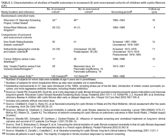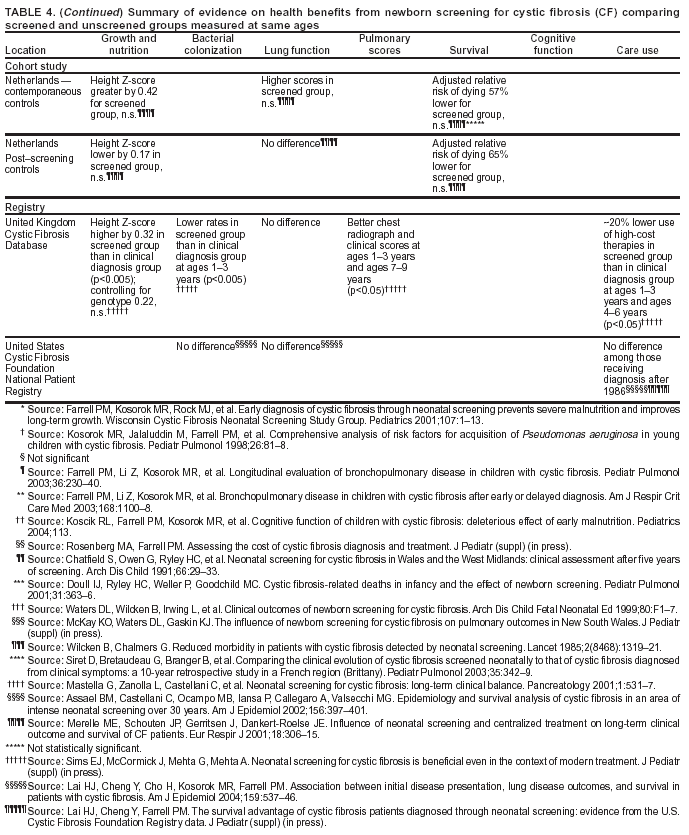 * The number of persons with CF at birth relative to the size of the birth cohort, even though they might not receive a diagnosis until later, because CF is a genetic condition. On the basis of data from states that reported confirmed results; however, reporting is incomplete (21). § The sensitivity for carrier screening is lower because, to be identified as a carrier couple, both parents must have a mutation included in the mutation panel. ¶ Refers to persons with a positive screening result who do not receive a diagnosis of disease. A positive screening result might provide useful information even absent a diagnosis. Infants with a positive screening result for CF identified using an IRT/DNA algorithm who do not receive a diagnosis of CF are carriers with one CFTR mutation (17). ** The Australian cross-sectional analysis identified significant differences in height-for-age (p<0.05) but not in weight-for-age; a longitudinal analysis of a subset of observations identified significant differences in weight-for-age (p<0.05) but not in height-for-age (81). One study reported a possible association of early asymptomatic detection and lung function among a subset of children born during 1987--1990, but ascertainment bias was a problem, because only children who received a diagnosis by the end of 1990 were included (26). §§ Four deaths not related to CF were recorded among screened children with CF in Brittany, three of which occurred neonatally. Infants with CF who died from such causes would not have received a diagnosis of CF in the absence of screening. In addition, one child with CF in Brittany died from causes associated with Down syndrome (87). ¶¶ Person-to-person transmission of P. aeruginosa in the Wisconsin study was not documented through microbiologic analysis. *** As of August 2004, all but two states routinely screened newborns for hemoglobinopathies (9).