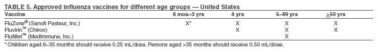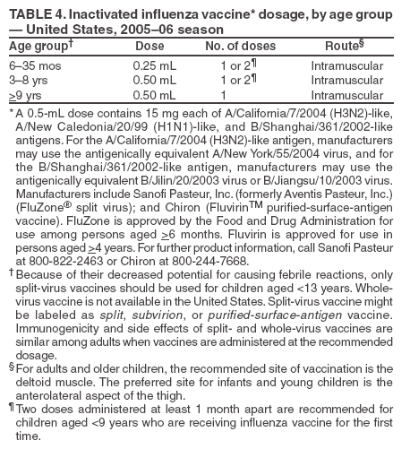 Influenza vaccine is part of the routine childhood immunization schedule. Sanofi Pasteur, Inc. (formerly Aventis Pasteur, Inc.) produces FluZone®, which is an inactivated influenza vaccine approved by the Food and Drug Administration (FDA) for persons aged >6 months. FluZone that is available in multi-dose vials contains thimerosal as a preservative. Thimerosal-free FluZone packaged as 0.25-mL unit dose syringes is available for use among persons aged 6--35 months. Thimerosal-free FluZone packaged as 0.5 mL unit dose syringes is available for use among persons aged >3 years. Fluvirin®, produced by Chiron, is an inactivated influenza vaccine available in a preservative-free formulation, is packaged as 0.5-mL single-dose syringes, and is licensed for use in persons aged >4 years. The preservative-free Fluvirin vaccine contains trace amounts of thimerosal. The total amount of inactivated influenza vaccine available without thimerosal as a preservative will be increased as manufacturing capabilities are expanded.