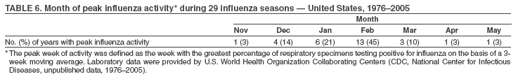 Epidemics of influenza typically occur during the winter months in temperate regions and have been responsible for an average of approximately 36,000 deaths/year in the United States during 1990--1999 (1). Influenza viruses also can cause pandemics, during which rates of illness and death from influenza-related complications can increase worldwide. Influenza viruses cause disease among all age groups (2--4). Rates of infection are highest among children, but rates of serious illness and death are highest among persons aged >65 years, children aged <2 years, and persons of any age who have medical conditions that place them at increased risk for complications from influenza (2,5--7).