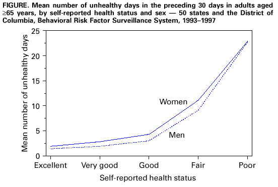* Total population = 171,620. The sample sizes are for known data regarding age, sex, and questions on unhealthy days. Return to top. Figure ![]() Return to top. Disclaimer All MMWR HTML versions of articles are electronic conversions from ASCII text into HTML. This conversion may have resulted in character translation or format errors in the HTML version. Users should not rely on this HTML document, but are referred to the electronic PDF version and/or the original MMWR paper copy for the official text, figures, and tables. An original paper copy of this issue can be obtained from the Superintendent of Documents, U.S. Government Printing Office (GPO), Washington, DC 20402-9371; telephone: (202) 512-1800. Contact GPO for current prices. **Questions or messages regarding errors in formatting should be addressed to mmwrq@cdc.gov.Page converted: 12/14/1999 |