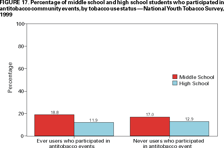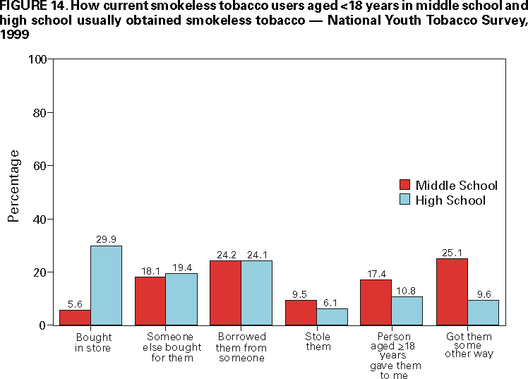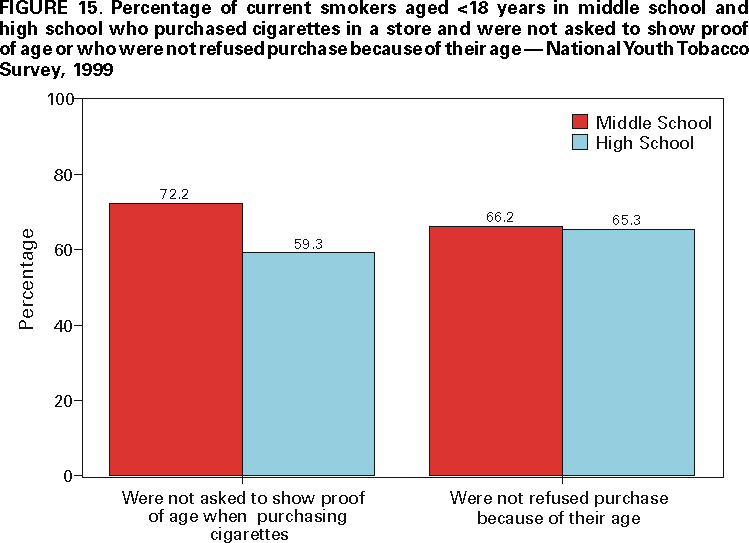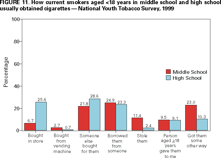 Office on Smoking and Health, National Center for Chronic Disease Prevention and Health Promotion American Legacy Foundation, Washington, DC CDC Foundation, Atlanta, Georgia Macro International, Calverton, Maryland State Youth Tobacco Survey Coordinators AbstractProblem/Condition: Tobacco use is the single leading preventable cause of death in the United States, accounting for approximately 430,000 deaths each year. The prevalence of cigarette smoking nationwide among high school students increased during the 1990s, peaking in 1996--1997, then began a gradual decline. Approximately 80% of tobacco users initiate use before the age of 18 years. If the trend in early initiation of cigarette smoking continues, approximately 5 million children aged <18 years who are living today will die prematurely as adults because they began to smoke cigarettes during adolescence. The economic liability associated with tobacco use ranges from $50 billion to $73 billion per year in medical expenses alone. Because of these health and economic consequences, CDC has recommended that states establish and maintain comprehensive tobacco control programs to reduce tobacco use among youth. Reporting Period: February 1998 through December 1999. Description of the System: To assist states in developing and maintaining their state-based comprehensive tobacco prevention and control programs, CDC developed the Youth Tobacco Surveillance and Evaluation System, which includes international, national, and state school-based surveys of middle school and high school students. Two components of this system are discussed --- the National Youth Tobacco Survey and the state Youth Tobacco Surveys. The national survey is representative of students in the 50 states and the District of Columbia; 15,061 students in 131 schools completed questionnaires in 1999. The state surveys were first conducted in 1998, when three states participated, and in 1999, when 13 states participated (13 states conducted middle school surveys and 10 states conducted high school surveys); state sample sizes ranged from 452 to 15,478 students. This report summarizes data from the 1999 national survey and the 1998 and 1999 state surveys. Results and Interpretation: Findings from the National Youth Tobacco Survey show current tobacco use ranges from 12.8% among middle school students to 34.8% among high school students. Cigarette smoking is the most prevalent form of tobacco used, followed by cigars and smokeless tobacco. Young people have strong cigarette brand preferences. Almost half of current smokers in both middle school and high school report that they usually smoke Marlboro® cigarettes. Black students are more likely to smoke Newport® cigarettes than any other brand. Half of current smokers in middle school and high school report that they want to completely stop smoking. Nearly one fourth of middle school and high school students who have never smoked cigarettes indicate that they are susceptible to initiating smoking in the next year. Environmental tobacco smoke exposure is very high among both middle school and high school students. During the week before the survey, approximately 9 out of 10 current smokers and half of never smokers were in the same room with someone who was smoking; 8 out of 10 current smokers and 3 out of 10 never smokers rode in a car with someone who was smoking. Six out of 10 current smokers and 3 out of 10 never smokers live in a home where someone else smokes cigarettes. Approximately 70% of middle school and 60% of high school students who currently smoke and are aged <18 years were not asked to show proof of age when they purchased cigarettes. Approximately three fourths of middle school and high school students have seen antismoking commercials; however, 90% report having seen actors smoking on television or in the movies. Approximately 2% of middle school and high school students who had never used tobacco would wear or use something with a tobacco company name or picture on it. This rate increases to approximately 20% for current tobacco users. Actions Taken: Youth Tobacco Survey data are used by health and education officials to improve national and state programs to prevent and control youth tobacco use. Many states also use the data in presentations to their state legislators to demonstrate the need for increased funding for smoking cessation and prevention programs for youth. INTRODUCTIONTobacco use is the single leading preventable cause of death in the United States (1), accounting for approximately 430,000 deaths each year (2). The prevalence of cigarette smoking nationwide among high school students increased during the 1990s (3), peaking in 1996--1997, and then began a gradual decline (4). Approximately 80% of tobacco users initiate use before the age of 18 years (5). If the trend in early initiation of cigarette smoking continues, approximately 5 million children aged <18 years who are living today will die prematurely as adults because they began to smoke cigarettes during adolescence (2). The economic liability associated with tobacco use ranges from $50 billion to $73 billion per year in medical expenses alone (6). CDC recommends that states establish and maintain comprehensive tobacco control programs to reduce tobacco use among youth (6). Surveillance and evaluation are among the primary elements of a comprehensive tobacco control program. To assist states in developing and maintaining their surveillance and evaluation systems, CDC developed the Youth Tobacco Surveillance and Evaluation System, which includes international, national, and state school-based surveys of middle school and high school students. Two components of this system are the National Youth Tobacco Survey (NYTS) and the state Youth Tobacco Surveys (YTS). The YTS and NYTS were developed to provide states with the data necessary to support the design, implementation, and evaluation of a comprehensive tobacco control program. Many states