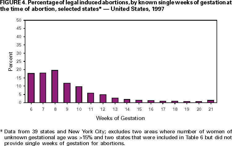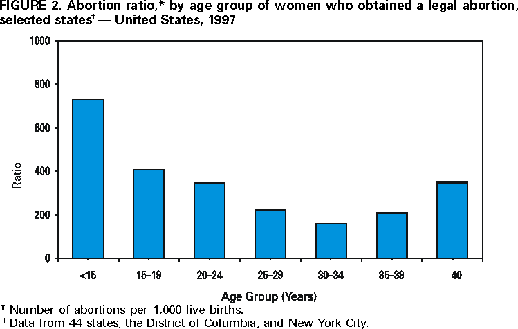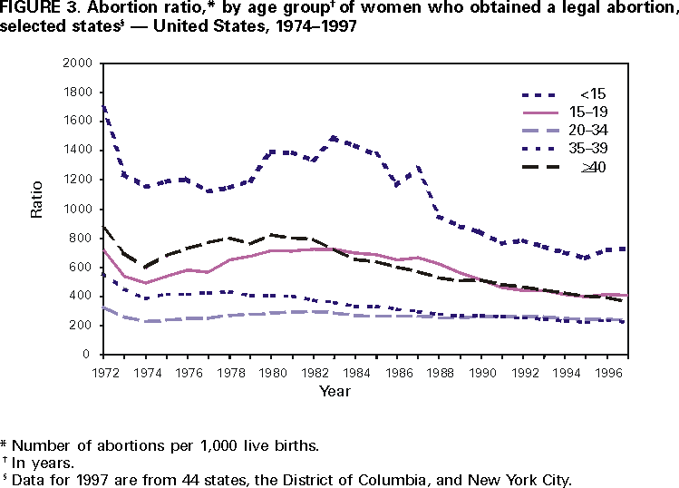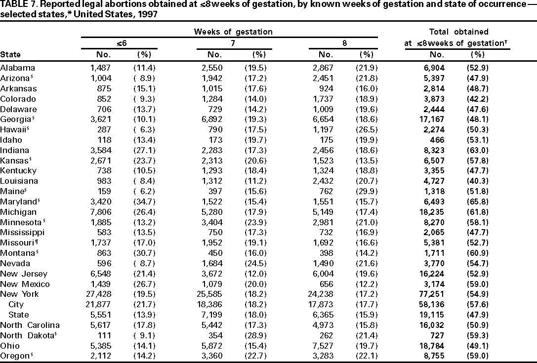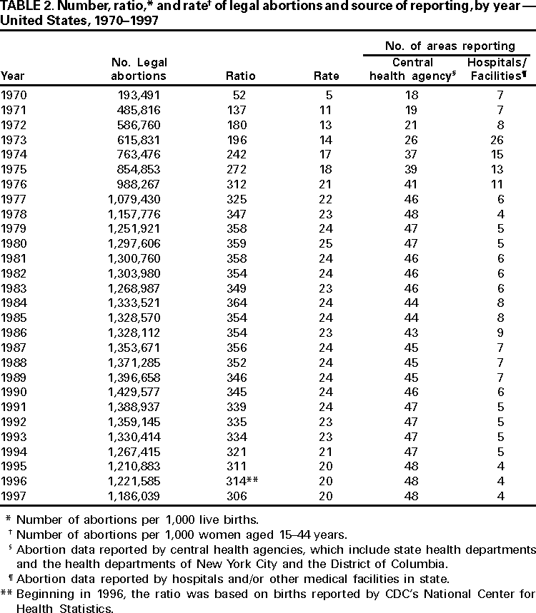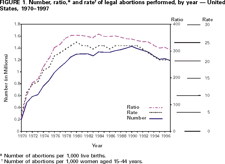 Persons using assistive technology might not be able to fully access information in this file. For assistance, please send e-mail to: mmwrq@cdc.gov. Type 508 Accommodation and the title of the report in the subject line of e-mail. Abortion Surveillance --- United States, 1997Lisa M. Koonin, M.N., M.P.H. Division of Reproductive Health Abstract Problem/Condition: In 1969, CDC began abortion surveillance to document the number and characteristics of women obtaining legal induced abortions, to monitor unintended pregnancy, and to assist efforts to identify and reduce preventable causes of morbidity and mortality associated with abortions. Reporting Period Covered: This report summarizes and reviews information reported to CDC regarding legal induced abortions obtained in the United States in 1997. Description of System: For each year since 1969, CDC has compiled abortion data by state where the abortion occurred. The data are received from 52 reporting areas in the United States: 50 states, the District of Columbia, and New York City. Results: In 1997, a total of 1,186,039 legal abortions were reported to CDC, representing a 3% decrease from the number reported for 1996. The abortion ratio was 306 legal induced abortions per 1,000 live births, and since 1995, the abortion rate has remained at 20 per 1,000 women aged 15--44 years. The availability of information about characteristics of women who obtained an abortion in 1997 varied by state and by the number of states reporting each characteristic. The total number of legal induced abortions by state is reported by state of residence and state of occurrence; characteristics of women obtaining abortions in 1997 are reported by state of occurrence. Women who were undergoing an abortion were more likely to be young (i.e., aged <25 years), white, and unmarried; approximately one half were obtaining an abortion for the first time. More than one half of all abortions for which gestational age was reported (55%) were performed at <8 weeks of gestation, and 88% were performed before 13 weeks. Overall, 18% of abortions were performed at the earliest weeks of gestation (<6 weeks), 18% at 7 weeks of gestation, and 20% at 8 weeks of gestation. From 1992 through 1997, increases have occurred in the percentage of abortions performed at the very early weeks of gestation. Few abortions were provided after 15 weeks of gestation --- 4% of abortions were obtained at 16--20 weeks, and 1.4% were obtained at >21 weeks. A total of 19 reporting areas submitted information regarding abortions performed by medical (nonsurgical) procedures, comprising <1% of procedures reported by all states. Younger women (i.e., aged <24 years) were more likely to obtain abortions later in pregnancy than were older women. Interpretation: From 1990 through 1995, the number of abortions declined each year; in 1996, the number increased slightly, and in 1997, the number of abortions in the United States declined to it lowest level since 1978. Public Health Actions: The number and characteristics of women who obtain abortions in the United States should continue to be monitored so that trends in induced abortion can be assessed and efforts to prevent unintended pregnancy can be evaluated. INTRODUCTIONIn 1969, CDC began abortion surveillance to document the number and characteristics of women obtaining legal induced abortions, to monitor unintended pregnancy, and to assist efforts to identify and reduce preventable causes of morbidity and mortality associated with abortions. This report is based on abortion data for 1997 provided to CDC's National Center for Chronic Disease Prevention and Health Promotion (NCCDPHP), Division of Reproductive Health. METHODSFor 1997, CDC compiled data from 52 reporting areas in the United States: 50 states, the District of Columbia, and New York City. Legal induced abortion was defined as a procedure, performed by a licensed physician or someone acting under the supervision of a licensed physician, that was intended to terminate a suspected or known intrauterine pregnancy and to produce a nonviable fetus at any gestational age (1,2). The total number of legal induced abortions was available or estimated from all reporting areas; however, not all of these areas collected information regarding some or all of the characteristics of women who obtained abortions. The availability of information about characteristics of women who obtained an abortion in 1997 varied by state. Most reporting areas (44 states, the District of Columbia, and New York City) collected and reported adequate abortion data (i.e., data with <15% unknown values and categorized in accordance with the study variables) by age of the woman, whereas only 26 states, the District of Columbia, and New York City collected and reported adequate abortion data by Hispanic ethnicity. Therefore, the findings in this report only reflect characteristics among women from reporting areas that submitted adequate data. In the "Results" section of this report, the percentage data for each table (with one exception) include unknown values; unknowns have not been redistributed for the calculation of these percentages (Tables 4, 6--13). In contrast, trend data (Table 1) include percentages based on known values. Areas were excluded from specific analyses if data regarding a given characteristic were unknown for >15% of women (Tables 1, 4--18). For 48 reporting areas, aggregated data concerning the number of women obtaining legal induced abortions were provided by the central health agency*; for the other four areas, data were provided by hospitals and other medical facilities (Table 2). Reporting areas provided numbers of abortions and data regarding characteristics of women obtaining abortions by state of occurrence. Only abortion totals (no information regarding characteristics of women) were available by state of residence for 1997; therefore, characteristics of women obtaining abortions were reported by the sta