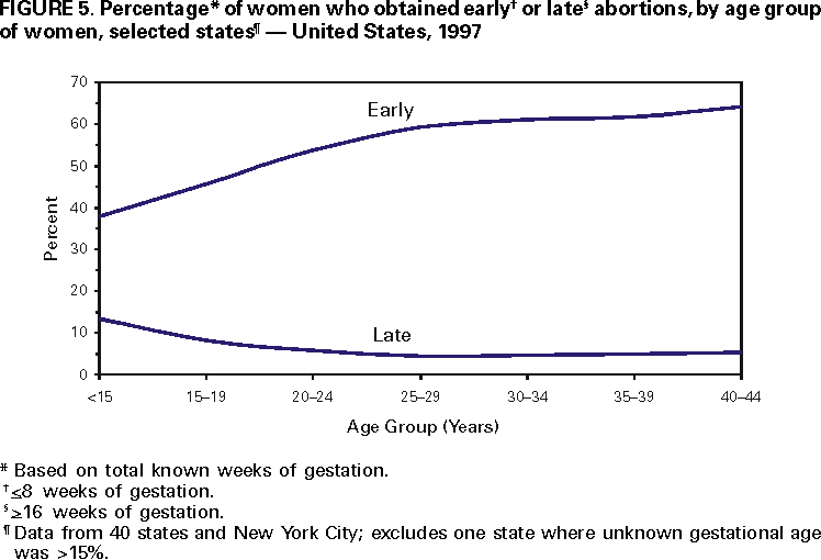 Abortion Surveillance --- United States, 1997Lisa M. Koonin, M.N., M.P.H. Division of Reproductive Health Abstract Problem/Condition: In 1969, CDC began abortion surveillance to document the number and characteristics of women obtaining legal induced abortions, to monitor unintended pregnancy, and to assist efforts to identify and reduce preventable causes of morbidity and mortality associated with abortions. Reporting Period Covered: This report summarizes and reviews information reported to CDC regarding legal induced abortions obtained in the United States in 1997. Description of System: For each year since 1969, CDC has compiled abortion data by state where the abortion occurred. The data are received from 52 reporting areas in the United States: 50 states, the District of Columbia, and New York City. Results: In 1997, a total of 1,186,039 legal abortions were reported to CDC, representing a 3% decrease from the number reported for 1996. The abortion ratio was 306 legal induced abortions per 1,000 live births, and since 1995, the abortion rate has remained at 20 per 1,000 women aged 15--44 years. The availability of information about characteristics of women who obtained an abortion in 1997 varied by state and by the number of states reporting each characteristic. The total number of legal induced abortions by state is reported by state of residence and state of occurrence; characteristics of women obtaining abortions in 1997 are reported by state of occurrence. Women who were undergoing an abortion were more likely to be young (i.e., aged <25 years), white, and unmarried; approximately one half were obtaining an abortion for the first time. More than one half of all abortions for which gestational age was reported (55%) were performed at <8 weeks of gestation, and 88% were performed before 13 weeks. Overall, 18% of abortions were performed at the earliest weeks of gestation (<6 weeks), 18% at 7 weeks of gestation, and 20% at 8 weeks of gestation. From 1992 through 1997, increases have occurred in the percentage of abortions performed at the very early weeks of gestation. Few abortions were provided after 15 weeks of gestation --- 4% of abortions were obtained at 16--20 weeks, and 1.4% were obtained at >21 weeks. A total of 19 reporting areas submitted information regarding abortions performed by medical (nonsurgical) procedures, comprising <1% of procedures reported by all states. Younger women (i.e., aged <24 years) were more likely to obtain abortions later in pregnancy than were older women. Interpretation: From 1990 through 1995, the number of abortions declined each year; in 1996, the number increased slightly, and in 1997, the number of abortions in the United States declined to it lowest level since 1978. Public Health Actions: The number and characteristics of women who obtain abortions in the United States should continue to be monitored so that trends in induced abortion can be assessed and efforts to prevent unintended pregnancy can be evaluated. INTRODUCTIONIn 1969, CDC began abortion surveillance to document the number and characteristics of women obtaining legal induced abortions, to monitor unintended pregnancy, and to assist efforts to identify and reduce preventable causes of morbidity and mortality associated with abortions. This report is based on abortion data for 1997 provided to CDC's National Center for Chronic Disease Prevention and Health Promotion (NCCDPHP), Division of Reproductive Health. METHODSFor 1997, CDC compiled data from 52 reporting areas in the United States: 50 states, the District of Columbia, and New York City. Legal induced abortion was defined as a procedure, performed by a licensed physician or someone acting under the supervision of a licensed physician, that was intended to terminate a suspected or known intrauterine pregnancy and to produce a nonviable fetus at any gestational age (1,2). The total number of legal induced abortions was available or estimated from all reporting areas; however, not all of these areas collected information regarding some or all of the characteristics of women who obtained abortions. The availability of information about characteristics of women who obtained an abortion in 1997 varied by state. Most reporting areas (44 states, the District of Columbia, and New York City) collected and reported adequate abortion data (i.e., data with <15% unknown values and categorized in accordance with the study variables) by age of the woman, whereas only 26 states, the District of Columbia, and New York City collected and reported adequate abortion data by Hispanic ethnicity. Therefore, the findings in this report only reflect characteristics among women from reporting areas that submitted adequate data. In the "Results" section of this report, the percentage data for each table (with one exception) include unknown values; unknowns have not been redistributed for the calculation of these percentages (Tables 4, 6--13). In contrast, trend data (Table 1) include percentages based on known values. Areas were excluded from specific analyses if data regarding a given characteristic were unknown for >15% of women (Tables 1, 4--18). For 48 reporting areas, aggregated data concerning the number of women obtaining legal induced abortions were provided by the central health agency*; for the other four areas, data were provided by hospitals and other medical facilities (Table 2). Reporting areas provided numbers of abortions and data regarding characteristics of women obtaining abortions by state of occurrence. Only abortion totals (no information regarding characteristics of women) were available by state of residence for 1997; therefore, characteristics of women obtaining abortions were reported by the state in which they were performed (Tables 4--18). However, for one state (i.e., Wisconsin), only characteristics of women who were residents and who obtained abortions in 1997 were reported to CDC and included in this report. Because