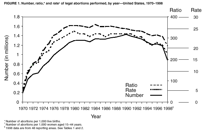 Abortion Surveillance---United States, 1998Joy Herndon, M.S. Abstract Problem/Condition: In 1969, CDC began abortion surveillance to document the number and characteristics of women obtaining legal induced abortions, to monitor unintended pregnancy, and to assist efforts to identify and reduce preventable causes of morbidity and mortality associated with abortions. Reporting Period Covered: This report summarizes and reviews information reported to CDC regarding legal induced abortions obtained in the United States in 1998. Description of System: For each year since 1969, CDC has compiled abortion data by occurrence. From 1973 to 1997, data were received from or estimated for 52 reporting areas in the United States: 50 states, the District of Columbia, and New York City. In 1998, CDC compiled abortion data from only 48 reporting areas; Alaska, California, New Hampshire, and Oklahoma did not report. Results: In 1998, 884,273 legal induced abortions were reported to CDC, representing a 2% decrease from the 900,171 legal induced abortions reported by the same 48 reporting areas for 1997. The abortion ratio, defined as the number of abortions per 1,000 live births, was 264, compared with 274 in 1997 (for the same 48 areas); the abortion rate for these 48 areas was 17 per 1,000 women aged 15--44 years for both 1997 and 1998. The availability of information about characteristics of women who obtained an abortion in 1998 varied by state and by the number of states reporting each characteristic. The total number of legal induced abortions by state is reported by state of residence and state of occurrence; characteristics of women obtaining abortions in 1998 are reported by state of occurrence. Women undergoing an abortion were likely to be young (i.e., age <25 years), white, and unmarried; slightly more than one half were obtaining an abortion for the first time. Of all abortions for which gestational age was reported, 56% were performed at <8 weeks of gestation, and 88% were performed before 13 weeks. Overall, 19% of abortions were performed at the earliest weeks of gestation (<6 weeks), 18% at 7 weeks, and 19% at 8 weeks. From 1992 (when this information was first collected) through 1998, an increasing percentage of abortions were performed at the very early weeks of gestation. Few abortions were provided after 15 weeks of gestation; 4% were obtained at 16--20 weeks, and 1.4% were obtained at >21 weeks. A total of 24 reporting areas submitted information stating that they performed medical (nonsurgical) procedures (two of these areas categorized medical abortions with "other" procedures), making up <1% of all procedures reported from all states. From 1993 through 1997 (years for which data have not been published previously and the most recent years for which such data are available), 36 women died as a result of complications from known legal induced abortion, and three deaths were associated with known illegal abortion. The annual case-fatality rate of legal induced abortion ranged from 0.3 to 0.8 abortion-related deaths per 100,000 reported legal induced abortions. Interpretation: From 1990 through 1995, the number of abortions declined each year; in 1996, the number increased slightly, but in 1997, it declined to its lowest level since 1978. In 1998, the number of abortions continued to decrease when comparing the 48 reporting areas. In 1997, as in previous years, deaths related to legal induced abortions occurred rarely. Public Health Actions Taken: The number and characteristics of women who obtain abortions in the United States should continue to be monitored so that trends in induced abortion can be assessed and efforts to prevent unintended pregnancy can be evaluated. IntroductionIn 1969, CDC began conducting abortion surveillance to document the number and characteristics of women obtaining legal induced abortions, to monitor unintended pregnancy, and to assist efforts to identify and reduce preventable causes of morbidity and mortality associated with abortions. This report is based on abortion data for 1998 provided to CDC's National Center for Chronic Disease Prevention and Health Promotion (NCCDPHP), Division of Reproductive Health. MethodsFor 1998, CDC compiled data that were voluntarily provided from 48 reporting areas in the United States: 46 states (excluding Alaska, California, New Hampshire, and Oklahoma), the District of Columbia, and New York City. Legal induced abortion was defined as a procedure, performed by a licensed physician or someone acting under the supervision of a licensed physician, that was intended to terminate a suspected or known intrauterine pregnancy and to produce a nonviable fetus at any gestational age (1,2). The total number of legal induced abortions was available from all reporting areas; however, not all of these areas collected information regarding some or all the characteristics of women who obtained abortions. Because these data are reported voluntarily, several limitations exist: 1) data are reported by the state in which the abortion was performed (state of occurrence); 2) data for states that do not report were not estimated for 1998 but were estimated before 1998; and 3) data provided to state or area health departments by providers may be incomplete. Therefore, the rates and ratios in this report may reflect an undercount of abortions for some states with more stringent legal requirements for obtaining an abortion (causing women to seek abortions elsewhere) and may be an overrepresentation for some states that have many out-of-state women obtaining legal induced abortions (3). The availability of information about characteristics of women who obtained an abortion in 1998 varied by state. Most reporting areas (45 states, the District of Columbia, and New York City) collected and reported adequate abortion data (i.e., data with <15% unknown values and categorized in accordance with the study variables) by age of the woman, whereas only 23 