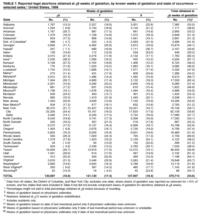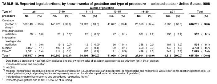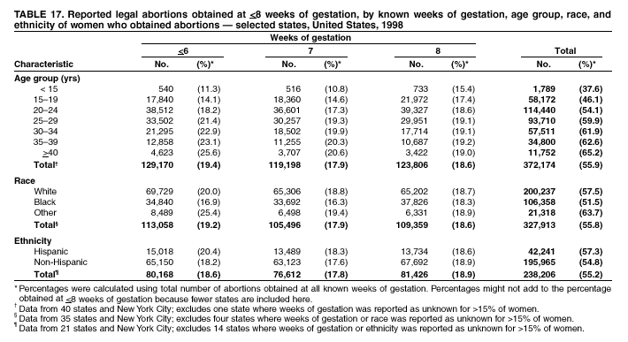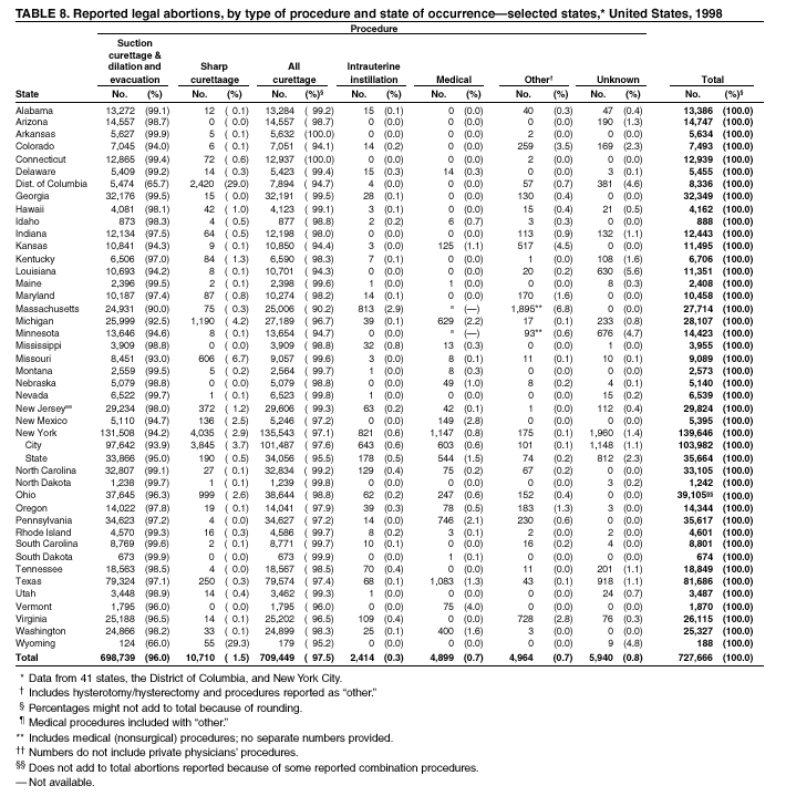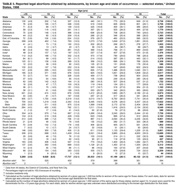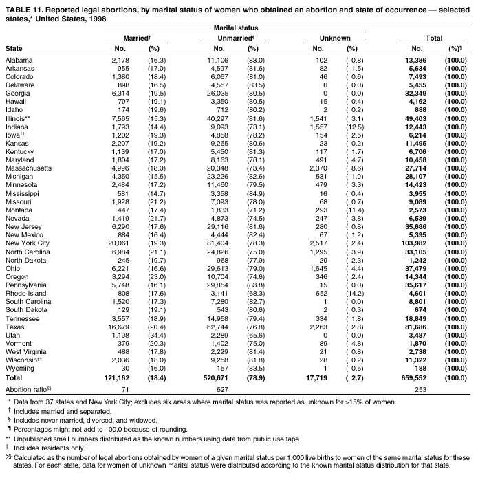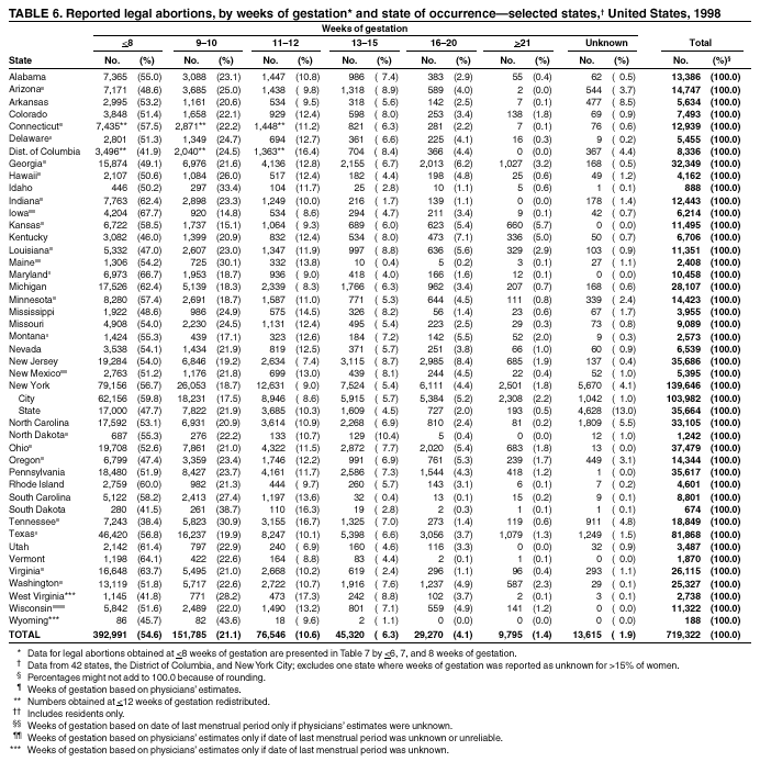 Persons using assistive technology might not be able to fully access information in this file. For assistance, please send e-mail to: mmwrq@cdc.gov. Type 508 Accommodation and the title of the report in the subject line of e-mail. Abortion Surveillance---United States, 1998Joy Herndon, M.S. Abstract Problem/Condition: In 1969, CDC began abortion surveillance to document the number and characteristics of women obtaining legal induced abortions, to monitor unintended pregnancy, and to assist efforts to identify and reduce preventable causes of morbidity and mortality associated with abortions. Reporting Period Covered: This report summarizes and reviews information reported to CDC regarding legal induced abortions obtained in the United States in 1998. Description of System: For each year since 1969, CDC has compiled abortion data by occurrence. From 1973 to 1997, data were received from or estimated for 52 reporting areas in the United States: 50 states, the District of Columbia, and New York City. In 1998, CDC compiled abortion data from only 48 reporting areas; Alaska, California, New Hampshire, and Oklahoma did not report. Results: In 1998, 884,273 legal induced abortions were reported to CDC, representing a 2% decrease from the 900,171 legal induced abortions reported by the same 48 reporting areas for 1997. The abortion ratio, defined as the number of abortions per 1,000 live births, was 264, compared with 274 in 1997 (for the same 48 areas); the abortion rate for these 48 areas was 17 per 1,000 women aged 15--44 years for both 1997 and 1998. The availability of information about characteristics of women who obtained an abortion in 1998 varied by state and by the number of states reporting each characteristic. The total number of legal induced abortions by state is reported by state of residence and state of occurrence; characteristics of women obtaining abortions in 1998 are reported by state of occurrence. Women undergoing an abortion were likely to be young (i.e., age <25 years), white, and unmarried; slightly more than one half were obtaining an abortion for the first time. Of all abortions for which gestational age was reported, 56% were performed at <8 weeks of gestation, and 88% were performed before 13 weeks. Overall, 19% of abortions were performed at the earliest weeks of gestation (<6 weeks), 18% at 7 weeks, and 19% at 8 weeks. From 1992 (when this information was first collected) through 1998, an increasing percentage of abortions were performed at the very early weeks of gestation. Few abortions were provided after 15 weeks of gestation; 4% were obtained at 16--20 weeks, and 1.4% were obtained at >21 weeks. A total of 24 reporting areas submitted information stating that they performed medical (nonsurgical) procedures (two of these areas categorized medical abortions with "other" procedures), making up <1% of all procedures reported from all states. From 1993 through 1997 (years for which data have not been published previously and the most recent years for which such data are available), 36 women died as a result of complications from known legal induced abortion, and three deaths were associated with known illegal abortion. The annual case-fatality rate of legal induced abortion ranged from 0.3 to 0.8 abortion-related deaths per 100,000 reported legal induced abortions. Interpretation: From 1990 through 1995, the number of abortions declined each year; in 1996, the number increased slightly, but in 1997, it declined to its lowest level since 1978. In 1998, the number of abortions continued to decrease when comparing the 48 reporting areas. In 1997, as in previous years, deaths related to legal induced abortions occurred rarely. Public Health Actions Taken: The number and characteristics of women who obtain abortions in the United States should continue to be monitored so that trends in induced abortion can be assessed and efforts to prevent unintended pregnancy can be evaluated. IntroductionIn 1969, CDC began conducting abortion surveillance to document the number and characteristics of women obtaining legal induced abortions, to monitor unintended pregnancy, and to assist efforts to identify and reduce preventable causes of morbidity and mortality associated with abortions. This report is based on abortion data for 1998 provided to CDC's National Center for Chronic Disease Prevention and Health Promotion (NCCDPHP), Division of Reproductive Health. MethodsFor 1998, CDC compiled data that were voluntarily provided from 48 reporting areas in the United States: 46 states (excluding Alaska, California, New Hampshire, and Oklahoma), the District of Columbia, and New York City. Legal induced abortion was defined as a procedure, performed by a licensed physician or someone acting under the supervision of a licensed physician, that was intended to terminate a suspected or known intrauterine pregnancy and to produce a nonviable fetus at any gestational age (1,2). The total number of legal induced abortions was available from all reporting areas; however, not all of these areas collected information regarding some or all the characteristics of women who obtained abortions. Because these data are reported voluntarily, several limitations exist: 1) data are reported by the state in which the abortion was performed (state of occurrence); 2) data for states that do not report were not estimated for 1998 but were estimated before 1998; and 3) data provided to state or area health departments by providers may be incomplete. Therefore, the rates and ratios in this report may reflect an undercount of abortions for some states with more stringent legal requirements for obtaining an abortion (causing women to seek abortions elsewhere) and may be an overrepresentation for some states that have many out-of-state women obtaining legal induced abortions (3). The availability of information about characteristics of women who obtained an abortion in 1998 varied by state. Most reporting areas (4