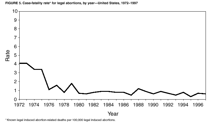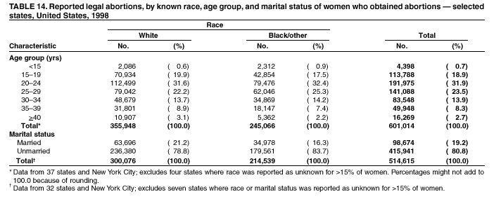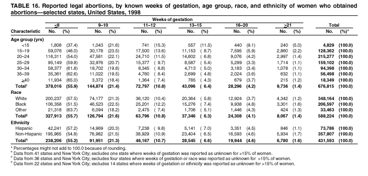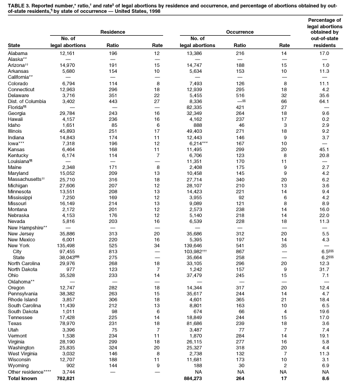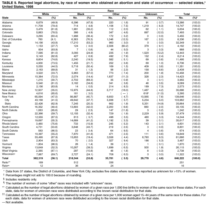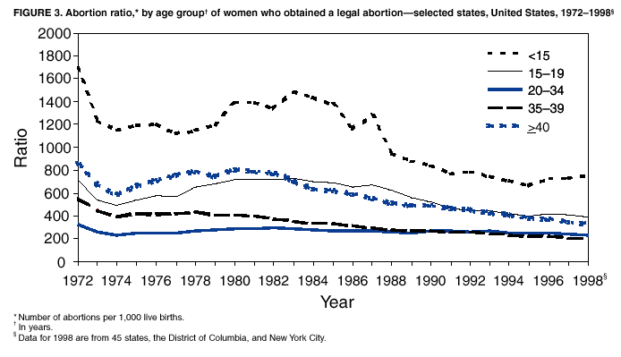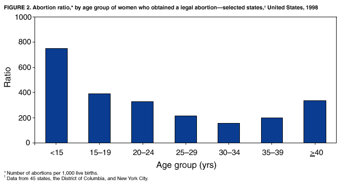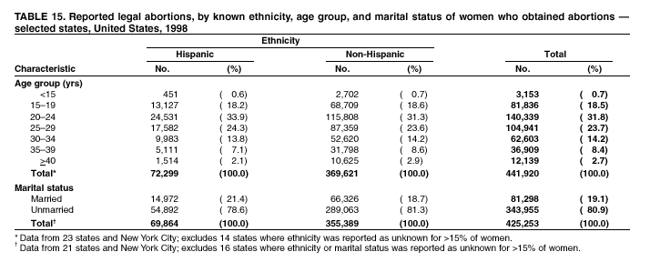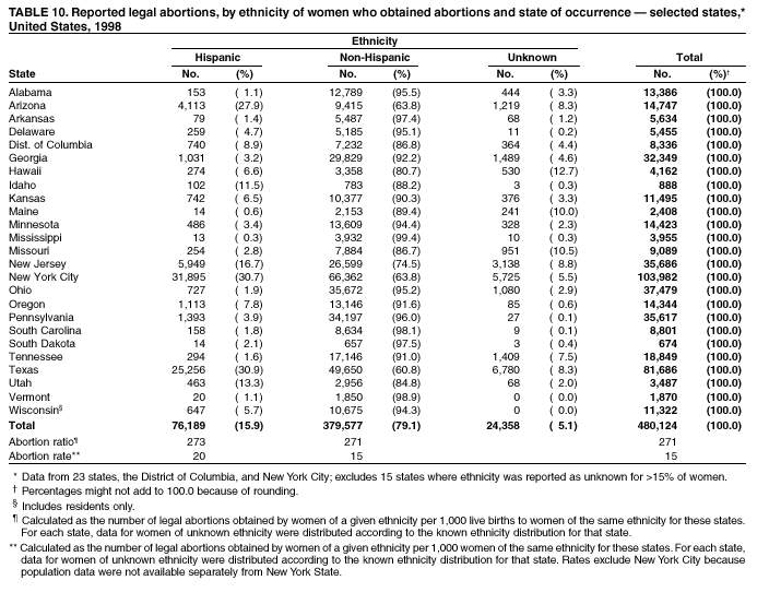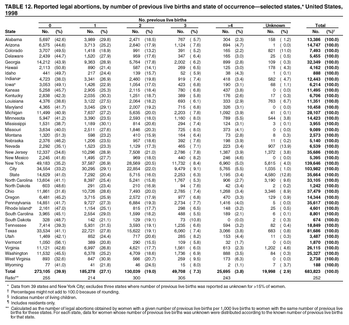 Persons using assistive technology might not be able to fully access information in this file. For assistance, please send e-mail to: mmwrq@cdc.gov. Type 508 Accommodation and the title of the report in the subject line of e-mail. Abortion Surveillance---United States, 1998Joy Herndon, M.S. Abstract Problem/Condition: In 1969, CDC began abortion surveillance to document the number and characteristics of women obtaining legal induced abortions, to monitor unintended pregnancy, and to assist efforts to identify and reduce preventable causes of morbidity and mortality associated with abortions. Reporting Period Covered: This report summarizes and reviews information reported to CDC regarding legal induced abortions obtained in the United States in 1998. Description of System: For each year since 1969, CDC has compiled abortion data by occurrence. From 1973 to 1997, data were received from or estimated for 52 reporting areas in the United States: 50 states, the District of Columbia, and New York City. In 1998, CDC compiled abortion data from only 48 reporting areas; Alaska, California, New Hampshire, and Oklahoma did not report. Results: In 1998, 884,273 legal induced abortions were reported to CDC, representing a 2% decrease from the 900,171 legal induced abortions reported by the same 48 reporting areas for 1997. The abortion ratio, defined as the number of abortions per 1,000 live births, was 264, compared with 274 in 1997 (for the same 48 areas); the abortion rate for these 48 areas was 17 per 1,000 women aged 15--44 years for both 1997 and 1998. The availability of information about characteristics of women who obtained an abortion in 1998 varied by state and by the number of states reporting each characteristic. The total number of legal induced abortions by state is reported by state of residence and state of occurrence; characteristics of women obtaining abortions in 1998 are reported by state of occurrence. Women undergoing an abortion were likely to be young (i.e., age <25 years), white, and unmarried; slightly more than one half were obtaining an abortion for the first time. Of all abortions for which gestational age was reported, 56% were performed at <8 weeks of gestation, and 88% were performed before 13 weeks. Overall, 19% of abortions were performed at the earliest weeks of gestation (<6 weeks), 18% at 7 weeks, and 19% at 8 weeks. From 1992 (when this information was first collected) through 1998, an increasing percentage of abortions were performed at the very early weeks of gestation. Few abortions were provided after 15 weeks of gestation; 4% were obtained at 16--20 weeks, and 1.4% were obtained at >21 weeks. A total of 24 reporting areas submitted information stating that they performed medical (nonsurgical) procedures (two of these areas categorized medical abortions with "other" procedures), making up <1% of all procedures reported from all states. From 1993 through 1997 (years for which data have not been published previously and the most recent years for which such data are available), 36 women died as a result of complications from known legal induced abortion, and three deaths were associated with known illegal abortion. The annual case-fatality rate of legal induced abortion ranged from 0.3 to 0.8 abortion-related deaths per 100,000 reported legal induced abortions. Interpretation: From 1990 through 1995, the number of abortions declined each year; in 1996, the number increased slightly, but in 1997, it declined to its lowest level since 1978. In 1998, the number of abortions continued to decrease when comparing the 48 reporting areas. In 1997, as in previous years, deaths related to legal induced abortions occurred rarely. Public Health Actions Taken: The number and characteristics of women who obtain abortions in the United States should continue to be monitored so that trends in induced abortion can be assessed and efforts to prevent unintended pregnancy can be evaluated. IntroductionIn 1969, CDC began conducting abortion surveillance to document the number and characteristics of women obtaining legal induced abortions, to monitor unintended pregnancy, and to assist efforts to identify and reduce preventable causes of morbidity and mortality associated with abortions. This report is based on abortion data for 1998 provided to CDC's National Center for Chronic Disease Prevention and Health Promotion (NCCDPHP), Division of Reproductive Health. MethodsFor 1998, CDC compiled data that were voluntarily provided from 48 reporting areas in the United States: 46 states (excluding Alaska, California, New Hampshire, and Oklahoma), the District of Columbia, and New York City. Legal induced abortion was defined as a procedure, performed by a licensed physician or someone acting under the supervision of a licensed physician, that was intended to terminate a suspected or known intrauterine pregnancy and to produce a nonviable fetus at any gestational age (1,2). The total number of legal induced abortions was available from all reporting areas; however, not all of these areas collected information regarding some or all the characteristics of women who obtained abortions. Because these data are reported voluntarily, several limitations exist: 1) data are reported by the state in which the abortion was performed (state of occurrence); 2) data for states that do not report were not estimated for 1998 but were estimated before 1998; and 3) data provided to state or area health departments by providers may be incomplete. Therefore, the rates and ratios in this report may reflect an undercount of abortions for some states with more stringent legal requirements for obtaining an abortion (causing women to seek abortions elsewhere) and may be an overrepresentation for some states that have many out-of-state women obtaining legal induced abortions (3). The availability of information about characteristics of women who obtained an abortion in 1998 varied by state. Most reporting areas (4