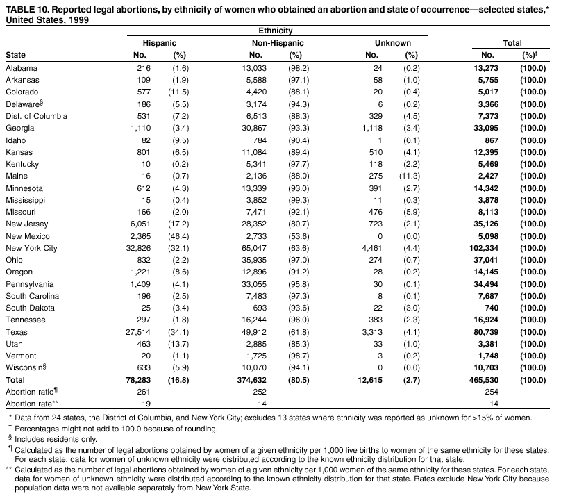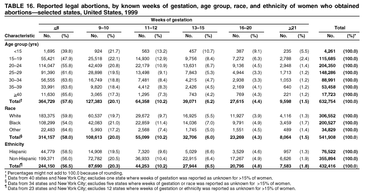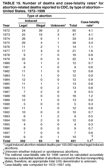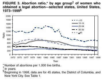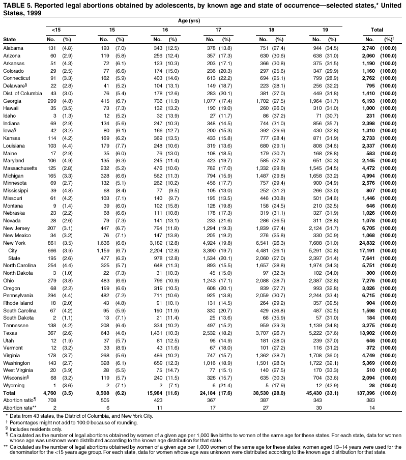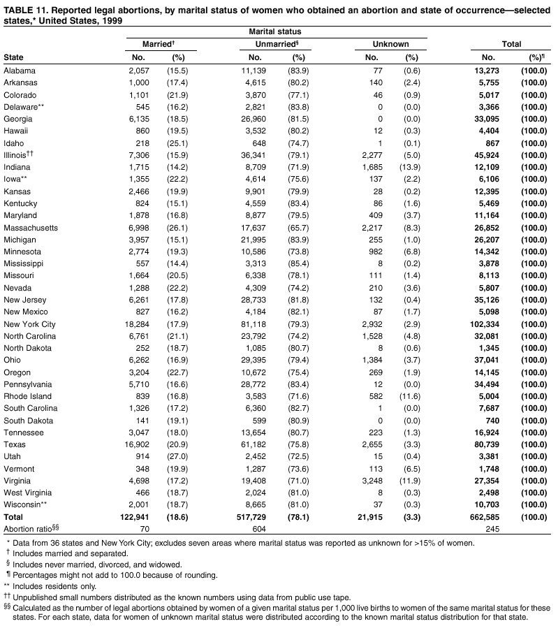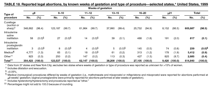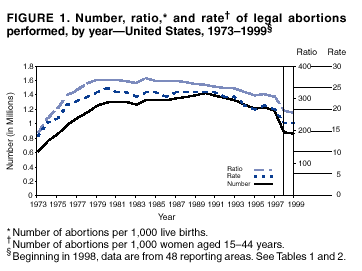 Persons using assistive technology might not be able to fully access information in this file. For assistance, please send e-mail to: mmwrq@cdc.gov. Type 508 Accommodation and the title of the report in the subject line of e-mail. Abortion Surveillance -- United States, 1999Laurie D. Elam-Evans, Ph.D. Abstract Problem/Condition: CDC began abortion surveillance in 1969 to document the number and characteristics of women obtaining legal induced abortions and to monitor unintended pregnancy. Reporting Period Covered: This report summarizes and describes data reported to CDC regarding legal induced abortions obtained in the United States in 1999. Description of System: For each year since 1969, CDC has compiled abortion data by state or area of occurrence. From 1973 through 1997, data were received from or estimated for 52 reporting areas in the United States: 50 states, the District of Columbia, and New York City. Beginning in 1998, CDC compiled abortion data from 48 reporting areas. Alaska, California, New Hampshire, and Oklahoma did not report, and data for these areas were not estimated. The availability of data regarding the characteristics of women who obtained an abortion in 1999 varied by state and by the number of states reporting each characteristic. The total number of legal induced abortions is reported by state of residence and also by state of occurrence for most areas; characteristics of women obtaining abortions in 1999 are reported by state of occurrence. Results: A total of 861,789 legal induced abortions were reported to CDC for 1999, representing a 2.5% decrease from the 884,273 legal induced abortions reported by the same 48 reporting areas for 1998. The abortion ratio, defined as the number of abortions per 1,000 live births, was 256 in 1999, compared with 264 reported for 1998; the abortion rate for these 48 reporting areas was 17 per 1,000 women aged 15--44 years for 1999, the same as in 1997 and 1998. The highest percentages of abortions were reported for women aged <25 years, women who were white, and unmarried women; slightly more than half were obtaining an abortion for the first time. Fifty-eight percent of all abortions for which gestational age was reported were performed at <8 weeks of gestation, and 88% were performed before 13 weeks. From 1992 (when these data were first collected) through 1999, increases have occurred in the percentage of abortions performed at <6 weeks of gestation. Few abortions were provided after 15 weeks of gestation; 4.3% were obtained at 16--20 weeks and 1.5% were obtained at >21 weeks. A total of 27 reporting areas submitted data stating that they performed medical (nonsurgical) procedures (two of these areas categorized medical abortions with "other" procedures), making up <1.0% of all procedures reported from all reporting areas. In 1998 (for which data have not been published previously and the most recent year for which such data are available), nine women died as a result of complications from known legal induced abortion; no deaths were associated with known illegal abortion. Interpretation: From 1990 through 1997, the number of legal induced abortions gradually declined. In 1998 and in 1999, the number of abortions continued to decrease when comparing the same 48 reporting areas. In 1998, as in previous years, deaths related to legal induced abortions occurred rarely. Public Health Action: Abortion surveillance in the United States should continue so that trends and characteristics of women who obtain legal induced abortions can be examined and efforts to prevent unintended pregnancy can be enhanced. Introduction CDC began conducting abortion surveillance in 1969 to document the number and characteristics of women obtaining legal induced abortions and to monitor unintended pregnancy. This report is based on abortion data for 1999 provided to CDC's National Center for Chronic Disease Prevention and Health Promotion (NCCDPHP), Division of Reproductive Health. MethodsFor 1999, CDC compiled data that were voluntarily provided from 48 reporting areas in the United States: 46 states (excluding Alaska, California, New Hampshire, and Oklahoma), the District of Columbia, and New York City. Legal induced abortion was defined as a procedure, performed by a licensed physician or someone acting under the supervision of a licensed physician, that was intended to terminate a suspected or known intrauterine pregnancy and to produce a nonviable fetus at any gestational age (1,2). The total number of legal induced abortions was available from all reporting areas; however, not all of these areas collected data regarding some or all of the characteristics of women who obtained abortions. Thus, the availability of these data varied by reporting area in 1999. The majority of reporting areas (45 states, the District of Columbia, and New York City) collected and reported adequate abortion data (i.e., data categorized in accordance with surveillance variables and with <15% unknown values) by age of the woman, whereas only 24 states, the District of Columbia, and New York City collected and reported adequate abortion data by Hispanic ethnicity. Therefore, the findings in this report reflect characteristics of women only from reporting areas that submitted adequate data for those characteristics. The percentage data for most state tables include unknown values; unknowns have not been redistributed for the calculation of these percentages. However, percentages based only on known values are included for trend data, out-of-area residents, adolescent ages, and two-characteristics tables. For the 48 reporting areas, data concerning the number of women obtaining legal induced abortions were provided by the central health agency.* These agencies provided data on numbers of abortions and characteristics of women by the state in which the abortions were performed (i.e., state of occurrence). For most states, only abortion totals were available by state of resi