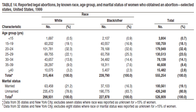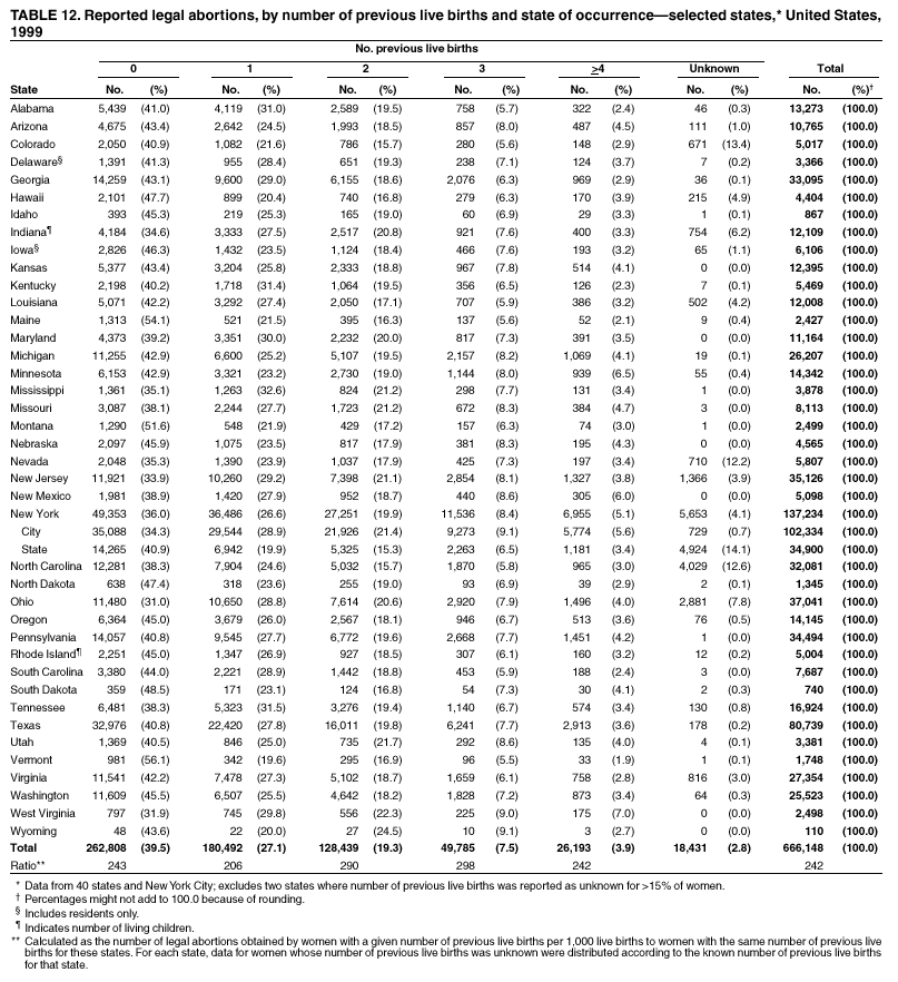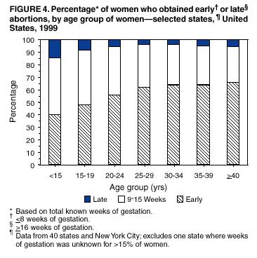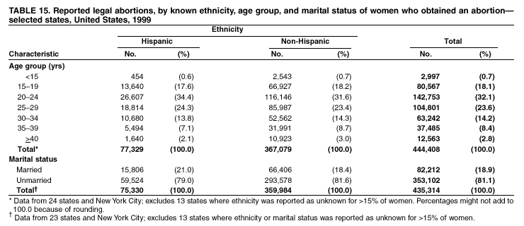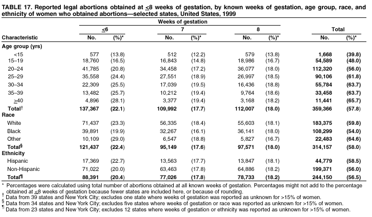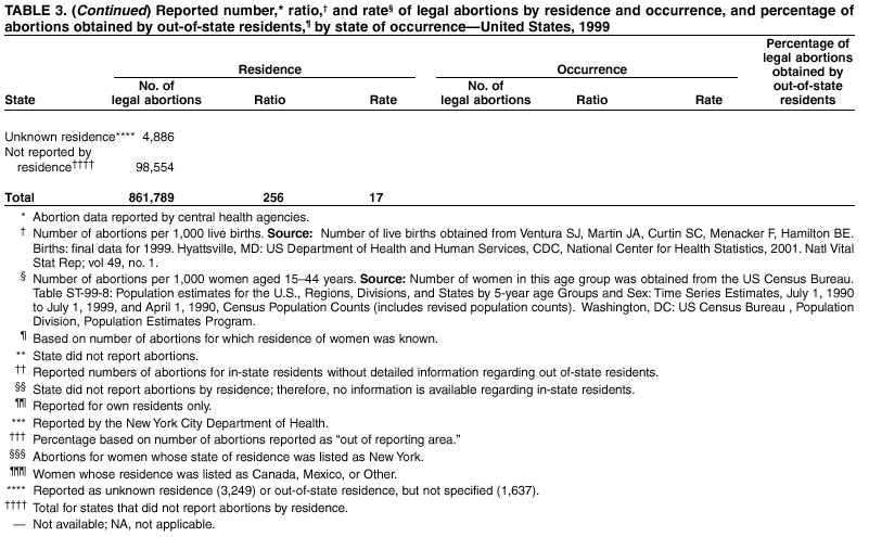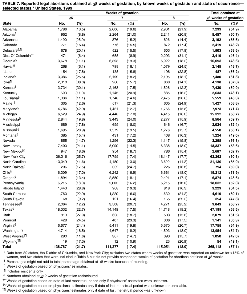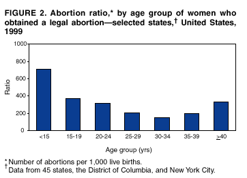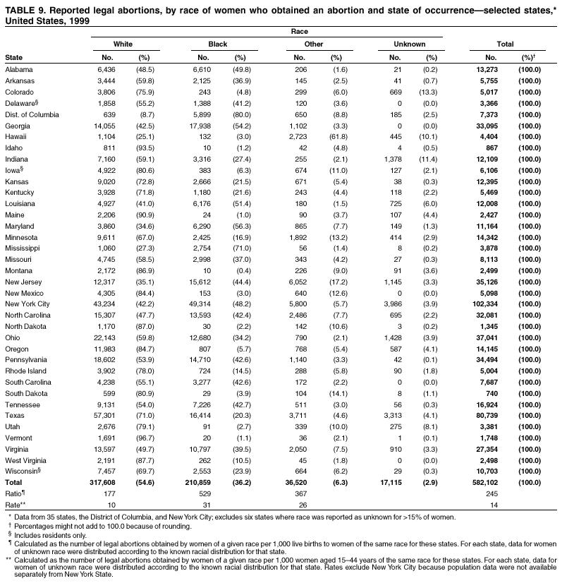 Persons using assistive technology might not be able to fully access information in this file. For assistance, please send e-mail to: mmwrq@cdc.gov. Type 508 Accommodation and the title of the report in the subject line of e-mail. Abortion Surveillance -- United States, 1999Laurie D. Elam-Evans, Ph.D. Abstract Problem/Condition: CDC began abortion surveillance in 1969 to document the number and characteristics of women obtaining legal induced abortions and to monitor unintended pregnancy. Reporting Period Covered: This report summarizes and describes data reported to CDC regarding legal induced abortions obtained in the United States in 1999. Description of System: For each year since 1969, CDC has compiled abortion data by state or area of occurrence. From 1973 through 1997, data were received from or estimated for 52 reporting areas in the United States: 50 states, the District of Columbia, and New York City. Beginning in 1998, CDC compiled abortion data from 48 reporting areas. Alaska, California, New Hampshire, and Oklahoma did not report, and data for these areas were not estimated. The availability of data regarding the characteristics of women who obtained an abortion in 1999 varied by state and by the number of states reporting each characteristic. The total number of legal induced abortions is reported by state of residence and also by state of occurrence for most areas; characteristics of women obtaining abortions in 1999 are reported by state of occurrence. Results: A total of 861,789 legal induced abortions were reported to CDC for 1999, representing a 2.5% decrease from the 884,273 legal induced abortions reported by the same 48 reporting areas for 1998. The abortion ratio, defined as the number of abortions per 1,000 live births, was 256 in 1999, compared with 264 reported for 1998; the abortion rate for these 48 reporting areas was 17 per 1,000 women aged 15--44 years for 1999, the same as in 1997 and 1998. The highest percentages of abortions were reported for women aged <25 years, women who were white, and unmarried women; slightly more than half were obtaining an abortion for the first time. Fifty-eight percent of all abortions for which gestational age was reported were performed at <8 weeks of gestation, and 88% were performed before 13 weeks. From 1992 (when these data were first collected) through 1999, increases have occurred in the percentage of abortions performed at <6 weeks of gestation. Few abortions were provided after 15 weeks of gestation; 4.3% were obtained at 16--20 weeks and 1.5% were obtained at >21 weeks. A total of 27 reporting areas submitted data stating that they performed medical (nonsurgical) procedures (two of these areas categorized medical abortions with "other" procedures), making up <1.0% of all procedures reported from all reporting areas. In 1998 (for which data have not been published previously and the most recent year for which such data are available), nine women died as a result of complications from known legal induced abortion; no deaths were associated with known illegal abortion. Interpretation: From 1990 through 1997, the number of legal induced abortions gradually declined. In 1998 and in 1999, the number of abortions continued to decrease when comparing the same 48 reporting areas. In 1998, as in previous years, deaths related to legal induced abortions occurred rarely. Public Health Action: Abortion surveillance in the United States should continue so that trends and characteristics of women who obtain legal induced abortions can be examined and efforts to prevent unintended pregnancy can be enhanced. Introduction CDC began conducting abortion surveillance in 1969 to document the number and characteristics of women obtaining legal induced abortions and to monitor unintended pregnancy. This report is based on abortion data for 1999 provided to CDC's National Center for Chronic Disease Prevention and Health Promotion (NCCDPHP), Division of Reproductive Health. MethodsFor 1999, CDC compiled data that were voluntarily provided from 48 reporting areas in the United States: 46 states (excluding Alaska, California, New Hampshire, and Oklahoma), the District of Columbia, and New York City. Legal induced abortion was defined as a procedure, performed by a licensed physician or someone acting under the supervision of a licensed physician, that was intended to terminate a suspected or known intrauterine pregnancy and to produce a nonviable fetus at any gestational age (1,2). The total number of legal induced abortions was available from all reporting areas; however, not all of these areas collected data regarding some or all of the characteristics of women who obtained abortions. Thus, the availability of these data varied by reporting area in 1999. The majority of reporting areas (45 states, the District of Columbia, and New York City) collected and reported adequate abortion data (i.e., data categorized in accordance with surveillance variables and with <15% unknown values) by age of the woman, whereas only 24 states, the District of Columbia, and New York City collected and reported adequate abortion data by Hispanic ethnicity. Therefore, the findings in this report reflect characteristics of women only from reporting areas that submitted adequate data for those characteristics. The percentage data for most state tables include unknown values; unknowns have not been redistributed for the calculation of these percentages. However, percentages based only on known values are included for trend data, out-of-area residents, adolescent ages, and two-characteristics tables. For the 48 reporting areas, data concerning the number of women obtaining legal induced abortions were provided by the central health agency.* These agencies provided data on numbers of abortions and characteristics of women by the state in which the abortions were performed (i.e., state of occurrence). For most states, only abortion totals were available by state of resi
