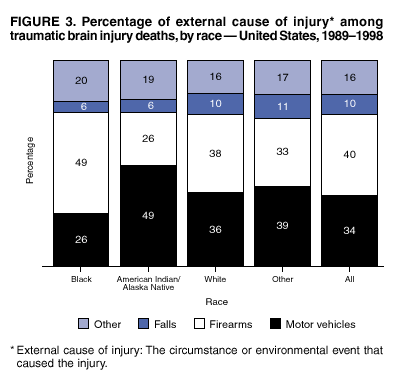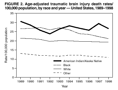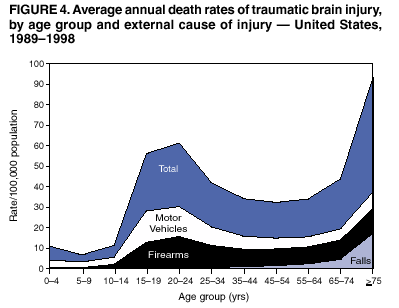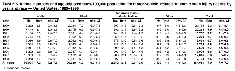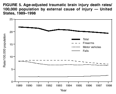 Persons using assistive technology might not be able to fully access information in this file. For assistance, please send e-mail to: mmwrq@cdc.gov. Type 508 Accommodation and the title of the report in the subject line of e-mail. Surveillance for Traumatic Brain Injury Deaths --- United States, 1989--1998Nelson Adekoya, Dr.P.H.1 Abstract Problem/Condition: Data indicate that approximately 50,000 U.S. residents die as a result of traumatic brain injury (TBI) annually. Survivors of TBI are often left with neuropsychologic impairments that result in disabilities affecting work or social activity. During 1979--1992, TBI-related death rates declined 22%, from 24.6 to 19.3 deaths/100,000 population. This report describes the epidemiology and trends in TBI-related mortality during 1989--1998. Reporting Period: January 1, 1989--December 31, 1998. Description of Systems: The National Center for Health Statistics (NCHS) Multiple Cause of Death public use data were analyzed for this study. Results: During 1989--1998, an annual average of 53,288 deaths (range: 51,848--54,501) among U.S. residents were associated with TBI. TBI-related death rates declined 11.4%, from 21.9 to 19.4/100,000 population. The major causes of TBI-related deaths were firearm-related (40%), motor-vehicle--related (34%), and fall-related (10%). The leading causes of TBI-related deaths differed among age groups. Among youths aged 0--19 years, motor-vehicle--related TBIs were the leading cause; among persons aged 20--74 years, firearm-related TBIs were the leading cause; and among persons aged >75 years, fall-related TBIs were the leading cause. Comparing rates in 1989 with rates in 1998, motor-vehicle--related causes declined by 22%; the majority of this decline occurred during the first 5 years of the period. During 1989--1998, firearm-related TBI-related deaths declined by 14%; approximately all of this decline occurred during the last 5 years of the period. In contrast, fall-related TBI-related death rates increased by 25% during the period. Conclusion: This analysis of mortality data identifies recent trends in TBI-related deaths occurring during 1989--1998. Fall-related TBI death rates have increased throughout the period. Firearm-related TBI death rates, which were increasing in the early 1990s, declined. Motor-vehicle--related TBI death rates, which were decreasing until the mid-1990s, have since demonstrated only a limited change. Public Health Action: More current population-based epidemiologic studies of TBI are needed to assess recent trends of etiologic factors, provide additional guidance for public policy, and evaluate prevention strategies. Despite the decline in fatal TBI incidence, TBI morbidity and mortality remains a public health challenge. Public health, law enforcement, and transportation safety professionals can address these challenges by implementing effective interventions based on a thorough assessment of the factors that influence health-related behaviors. IntroductionTraumatic brain injury (TBI) is a major cause of morbidity and mortality in the United States (1--18). Each year, approximately 50,000 deaths in the United States are associated with TBI (19), representing >33% of all injury-related deaths. Among survivors of TBI, neuropsychologic and other disabilities (20) are common and often require extensive rehabilitation services and sometimes long-term care. TBI results in substantial loss to persons, their families, and society (21--23); in 1995, the total direct and indirect financial costs of these injuries were estimated at $56 billion (23). In 1989, the Federal Interagency Head Injury Task Force identified traumatic brain injury as a critical public health problem (24). Since 1989, CDC has published analyses of trends in TBI mortality (1,5,19); the most recent of these indicated that TBI mortality rates decreased from 24.6 to 19.3 deaths/100,000 population during 1979--1992, a decline of 22% (19). This decline in mortality was accompanied by changes in distribution of the major external causes (i.e., the circumstance or environmental event that caused the injury) of TBI-related death, such that firearm-related injury surpassed motor-vehicle--related injury as the leading cause of TBI-related deaths in 1990. In 1995, CDC developed guidelines for surveillance of TBI (25) and, with funding authorized under Public Law 104-166 (the Traumatic Brain Injury Act of 1996), supported development of a multistate TBI surveillance system (26,27). This analysis examines more recent trends in TBI mortality. Specifically, this analysis of mortality data 1) characterizes secular trends of TBI-related deaths during 1989--1998, 2) describes differences in risk for death by age, sex, and race, 3) identifies populations at the greatest risk, and 4) describes trends among the leading external causes of TBI-related death: firearm-related injury, motor-vehicle--related injury crashes, and fall-related injury. Data tabulations are also provided to serve as reference material. MethodsData SourceData from CDC's National Center for Health Statistics (NCHS) Multiple Cause of Death public use data files were analyzed (28) for January 1, 1989--December 31, 1998. These mortality data were compiled from death certificates submitted from the vital records offices of all 50 states and the District of Columbia. Causes of death were recorded on the death certificate by the attending physician, medical examiner, or coroner by using a format specified by the World Health Organization and endorsed by CDC (29). Case DefinitionCases of TBI deaths were identified and selected where >1 diagnostic code representing TBI (25) was included in the sequence of conditions contributing to death. These diagnostic codes comprised the following International Classification of Diseases, 9th Revision (ICD-9) (29) codes:
