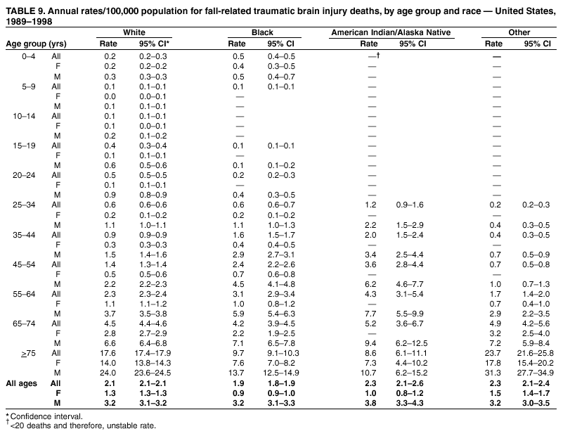 Additionally, reported death rates are further subcategorized for firearm-related injuries: suicide (E955.0--E955.4) and homicide (E965.0--E965.4). Race-specific fatal TBI rates for the three race categories with the highest incidence of TBI (i.e., black, American Indian/Alaska Native, and white) were calculated, as well as sex- and age-specific rates. These rates were based on U.S. resident estimates from population microdata files maintained by the U.S. Bureau of Census for individual years (30). Age-adjusted rates were standardized to U.S. census population estimates for 2000 by direct method. Calculations of age-adjusted and age-specific rates excluded cases with missing age data (N = 511); the latter were included in the calculation of crude rates. Appropriate 95% confidence intervals were calculated for the rates on the basis of standard errors for random variation in the number of deaths each year, as recommended by NCHS (31). Linear regression was used to determine the significance of decline during the interval and the decline of specific external causes of death (e.g., motor-vehicle--related, firearm-related, and fall-related TBIs). Differences with p values <0.05 were considered statistically significant. ResultsTBI-Related Deaths by Age, Sex, and RaceDuring 1989--1998, an annual average of 53,288 deaths among U.S. residents were associated with TBI, for a rate of 20.6/100,000 population (range: 51,848--54,501) (Table 1). During this interval, TBI-related death rates declined 11.4%, from 21.9 to 19.4/100,000 (p < 0.0001). Age Groups The TBI-related death rate for the surveillance period was highest among persons aged >75 years (Figure 1). During 1989--1998, TBI-related death rates declined in all age groups aged <75 years (Table 2), but deaths rates increased for persons aged >75 years from 50.0/100,000 to 60.5/100,000 (21%). Sex The TBI-related death rate was three times higher for males, compared with females, with average annual rates of 33.0 and 9.8/100,000 population, respectively (Table 1). During 1989--1998, TBI-related death rates declined 13% among males (p = <0.01) and 7% among females (p = 0.11). For the surveillance period, TBI-related death rates of males were higher than that of females among all age groups. Race TBI-related death rates were highest among American Indian/Alaska Natives at 27.2 deaths/100,000 population (41.5 and 13.8/100,000 among males and females, respectively) (Table 1) (Figure 2). Death rates among this population tended to decrease (13%) during the surveillance period, although this decrease was not statistically significant. Among blacks, the average TBI-related death rate during the surveillance period was 25.0 deaths/100,000 population (42.2 and 10.5/100,000 among males and females, respectively). Among racial populations evaluated, the greatest decrease in TBI-related mortality was observed among blacks (20%), with the majority of the decrease (19%) occurring in the interval 1994--1998. Among whites, the average TBI-related death rate during the surveillance period was 20.1 deaths/100,000 population (32 and 9.7/100,000 population among males and females, respectively). During 1989--1998, a 10% decrease in rates (p = <0.01) was observed for whites. Other races and persons with unknown race information (representing 2% of TBI fatalities) were grouped together (Table 1) with an overall death rate of 11.9 deaths/100,000 population (17.2 and 7.2/100,000 population among males and females, respectively). Death rates also decreased 17% among this group during the surveillance period. Major External Causes of TBI-Related DeathsFor the surveillance period, firearm-related, motor-vehicle--related, and fall-related TBIs were the three leading underlying causes of TBI-related death, accounting for 40%, 34%, and 10%, respectively, of all TBI-related deaths (Figure 3). Other causes, including cases with missing external cause-of-injury codes, accounted for 16%. The leading causes of TBI-related death differed among specific age groups: fatal motor-vehicle injuries were the leading cause of TBI-related deaths among children and youths aged 0--19 years (62%); fatal firearm-related injuries were the leading cause among adults aged 20--74 years (52%); and fatal fall-related injuries were the leading cause among adults aged >75 years (46%) (Figure 4) (Table 3). Trends by Cause During 1989--1998, the rates for fall-related TBI deaths increased by 25% (Table 4); whereas the rates for firearm-related TBIs declined by 14% (p = 0.02) (Table 5); and the rates for motor-vehicle--related TBIs declined by 22% (Table 6). Shifts occurred in observed trends between the first half and second half of the surveillance period. Firearm-related TBI rates began to decline after 1994. In contrast, motor-vehicle--related TBI rates declined 19% during 1989--1994, but since then have declined only slightly (Figure 5). The rates of fall-related TBIs began to increase in 1995. Firearm-Related TBI Deaths by Age, Sex, Intentionality, and Race The highest firearm-related TBI death rates were among persons aged 20--24 years (Table 3). The majority of firearm-related TBI deaths involved males (85%), among whom the death rate was substantially greater than among females (14.5 versus 2.4/100,000 population, respectively). Among all firearm-related TBI deaths; 68% were suicides; 27% were homicides (Table 5); and 5% were either unintentional, of unknown intentionality, or related to legal intervention. During 1989--1998, death rates for TBI involving firearms decreased 20% for homicides and 9% for suicides (p = <0.01). Firearm-related TBI death rates varied substantially by race (Tables 5 and 7). Firearm-related injury was the leading cause of TBI-related deaths among blacks, and 70% of these were homicides; rates were highest among males aged 20--24 years (60.7/100,000 population) (Table 7). During 1989--1998, firearm-related TBI death rates among blacks declined by 23%, although not stat
