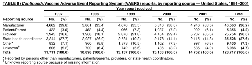 VAERS reports were received primarily from vaccine manufacturers (36.2%), state and local health departments (27.6%), and health-care providers (20.0%), with fewer reports filed directly by patients and parents (4.2%), or others (7.3%) (Table 8). Data documented a continuous increase in the proportion of reporting by health-care providers during the 11-year period. The percentage of reports from health-care providers increased from 11.4% in 1991 to 35.3% in 2001. The improvement in reporting from health-care providers might reflect the efforts of the VAERS working group to enhance communication with physicians through yearly direct mailing, continuing medical education (CME), and other sources. In addition, publications of analyses of VAERS data might have increased health-care providers' recognition of the potential value of reporting.