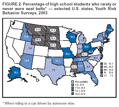 Persons using assistive technology might not be able to fully access information in this file. For assistance, please send e-mail to: mmwrq@cdc.gov. Type 508 Accommodation and the title of the report in the subject line of e-mail. Youth Risk Behavior Surveillance --- United States, 2003Please note: An erratum has been published for this article. To view the erratum, please click here. Jo Anne Grunbaum, Ed.D.1 Abstract Problem/Condition: Priority health-risk behaviors, which contribute to the leading causes of morbidity and mortality among youth and adults, often are established during youth, extend into adulthood, are interrelated, and are preventable. Reporting Period: This report covers data collected during February--December 2003. Description of System: The Youth Risk Behavior Surveillance System (YRBSS) monitors six categories of priority health-risk behaviors among youth and young adults --- behaviors that contribute to unintentional injuries and violence; tobacco use; alcohol and other drug use; sexual behaviors that contribute to unintended pregnancy and sexually transmitted diseases (STDs), including human immunodeficiency virus (HIV) infection; unhealthy dietary behaviors; and physical inactivity --- plus overweight. YRBSS includes a national school-based survey conducted by CDC as well as state and local school-based surveys conducted by education and health agencies. This report summarizes results from the national survey, 32 state surveys, and 18 local surveys conducted among students in grades 9--12 during February--December 2003. Results and Interpretation: In the United States, 70.8% of all deaths among persons aged 10--24 years result from only four causes: motor-vehicle crashes, other unintentional injuries, homicide, and suicide. Results from the 2003 national Youth Risk Behavior Survey demonstrated that, during the 30 days preceding the survey, numerous high school students engage in behaviors that increase their likelihood of death from these four causes: 30.2% had ridden with a driver who had been drinking alcohol; 17.1% had carried a weapon; 44.9% had drunk alcohol; and 22.4% had used marijuana. In addition, during the 12 months preceding the survey, 33.0% of high school students had been in a physical fight, and 8.5% had attempted suicide. Substantial morbidity and social problems among young persons also result from unintended pregnancies and STDs, including HIV infection. In 2003, 46.7% of high school students had ever had sexual intercourse; 37% of sexually active students had not used a condom at last sexual intercourse; and 3.2% had ever injected an illegal drug. Among adults aged >25 years, 62.9% of all deaths results from two causes: cardiovascular diseases and cancer. Results from the 2003 national Youth Risk Behavior Survey demonstrate that the majority of risk behaviors associated with these two causes of death are initiated during adolescence. In 2003, a total of 21.9% of high school students had smoked cigarettes during the 30 days preceding the survey; 78% had not eaten >5 servings/day of fruits and vegetables during the 7 days preceding the survey; 33.4% had participated in an insufficient amount of physical activity; and 13.5% were overweight. Actions Taken: YRBSS data are being used to measure progress toward achieving 15 national health objectives for 2010 and three of the 10 leading health indicators. In addition, education and health officials at national, state, and local levels are using these YRBSS data to improve policies and programs to reduce priority health-risk behaviors among youth. IntroductionIn the United States, 70.8% of all deaths among youth and young adults aged 10--24 years result from only four causes: motor-vehicle crashes (32.3%), other unintentional injuries (11.7%), homicide (15.1%), and suicide (11.7%) (1). Substantial morbidity and social problems also result from the approximately 870,000 pregnancies that occur each year among females aged 15--19 years (2) and the estimated 3 million cases of sexually transmitted diseases (STDs) that occur each year among persons aged 10--19 years (3). Among adults aged >25 years, 62.9% of all deaths in the United States result from cardiovascular diseases (39.4%) and cancer (23.5%) (1). Leading causes of morbidity and mortality among all age groups in the United States are related to the following: behaviors that contribute to unintentional injuries and violence; tobacco use; alcohol and other drug use; sexual behaviors that contribute to unintended pregnancy and STDs, including human immunodeficiency virus (HIV) infection; unhealthy dietary behaviors; physical inactivity; and overweight. Behaviors are frequently interrelated and often are established during youth and extend into adulthood. To monitor priority health-risk behaviors among youth and young adults in each of these six categories, CDC developed the Youth Risk Behavior Surveillance System (YRBSS) (4). YRBSS includes national, state, and local school-based surveys of students in grades 9--12. National surveys were conducted biennially since 1991. Comparable state and local surveys also were conducted (Box). This report summarizes results from the 2003 national school-based survey and trends during 1991--2003 in selected risk behaviors. Data from the 32 state and 18 of the 20 local school-based surveys with weighted data in 2003 also are included (Figure 1). Data from the remaining 11 state and 2 local school-based surveys with unweighted data are not included in this report. The national survey, the 32 weighted state surveys, and 15 of the weighted local surveys were conducted during spring 2003. Three of the local surveys were conducted during fall 2003. MethodsSamplingNational Youth Risk Behavior Survey The sampling frame for the 2003 national Youth Risk Behavior Survey (YRBS) was obtained from the Quality Education Data (QED), Inc., database (5). The QED database encompasses both private and public schools, includes the lat