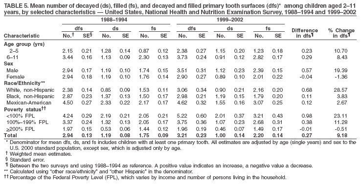 Dye, DDS,3 The material in this report originated in the National Center for Chronic Disease Prevention and Health Promotion, George A. Mensah, MD, Acting Director; and the Division of Oral Health, William Maas, DDS, Director. Corresponding author: Eugenio D. Beltrán-Aguilar, DMD, Division of Oral Health, National Center for Chronic Disease Prevention and Health Promotion, MS F-10, 4770 Buford Hwy, NE Atlanta, GA 30341; Telephone: 770-488-6069; Fax: 770-488-6080; E-mail: edb4@cdc.gov. Abstract Problem/Condition: Dental caries is a common chronic disease that causes pain and disability across all age groups. If left untreated, dental caries can lead to pain and infection, tooth loss, and edentulism (total tooth loss). Dental sealants are effective in preventing dental caries in the occlusal (chewing) and other pitted and fissured surfaces of the teeth. Enamel fluorosis is a hypomineralization of enamel related to fluoride exposure during tooth formation (first 6 years for most permanent teeth). Exposure to fluoride throughout life is effective in preventing dental caries. This is the first CDC Surveillance Summary that addresses these conditions and practices. Reporting Period: 1988--1994 and 1999--2002. System Description: The National Health and Nutrition Examination Survey (NHANES) is an ongoing survey of representative samples of the civilian, noninstitutionalized U.S. population aged >2 months in NHANES 1988--1994 and all ages during 1999--2002. The dental component gathered information on persons aged >2 years. Results: During 1999--2002, among children aged 2--11 years, 41% had dental caries in their primary teeth. Forty-two percent of children and adolescents aged 6--19 years and approximately 90% of adults had dental caries in their permanent teeth. Among children aged 6--19 years, 32% had received dental sealants. Adults aged >20 years retained a mean of 24 of 28 natural teeth and 8% were edentulous. Among persons aged 6--39 years, 23% had very mild or greater enamel fluorosis. Disparities were noticed across all age groups, among racial/ethnic groups, persons with lower education and income, and by smoking status. From 1988--1994 to 1999--2002, four trends were observed: 1) no change in the prevalence of dental caries in primary teeth among children aged 2--11 years, 2) a reduction in prevalence of caries in permanent teeth of up to 10 percentage points among persons aged 6--19 years and up to six percentage points among dentate adults aged >20 years, 3) an increase of 13 percentage points in dental sealants among persons aged 6--19 years, and 4) a six percentage point reduction in total tooth loss (edentulism) among persons aged >60 years. Interpretation: The findings of this report indicate that the dental caries status of permanent teeth has improved since the 1988--1994 survey. Despite the decrease in caries prevalence and severity in the permanent dentition and the increase in the proportion of children and adolescents who benefit from dental sealants, disparities remain. Public Health Action: These data provide information for public health professionals in designing interventions to improve oral health and to reduce disparities in oral health, for researchers in assessing factors associated with disparities and dental caries in primary teeth, and in designing timely surveillance tools to monitor total fluoride exposure. IntroductionSince 1996, a consortium formed by CDC and the National Institute of Dental and Craniofacial Research (NIDCR) has developed and implemented a plan to use the National Health and Nutrition Examination Survey (NHANES) to obtain epidemiologic estimates of dental conditions and preventive efforts. NHANES provides data for oral health surveillance at the national level. The specific objectives are to 1) assess the prevalence of major oral diseases and conditions, including dental caries, periodontal diseases, dental trauma, and enamel fluorosis; 2) assess efforts to prevent disease and disability, including prevalence of dental sealants and use/status of dentures; 3) monitor the oral health status of minority and underserved populations; and 4) provide estimates to evaluate the national health objectives for 2000 and 2010 related to oral health. Beginning in 1999, NHANES changed from a periodic, multiyear survey to a continuous, annual survey. Unlike previous NHANES surveys, beginning in 1999, data on a nationally representative sample of the U.S., noninstitutionalized civilian population from birth and all ages were released on a 2-year cycle. Oral health data were collected for persons aged >2 years, and data for NHANES 1999--2000 and for NHANES 2001--2002 were released for public use in March 2004 and in February 2005, respectively. This report was prepared by members of the consortium and provides summary data for study participants (SPs) for selected elements of the dental component (i.e., dental caries, dental sealants, enamel fluorosis, tooth retention, and edentulism [total tooth loss]). In this report, data from NHANES 1999--2000 and NHANES 2001--2002 were used in the aggregate and are referred to as NHANES 1999--2002. In addition, recalculated estimates for NHANES III (1988--1994), using comparable variables and age groups, were included to assess trends. MethodsNHANES 1999--2002 oversampled certain population subgroups to improve reliability of epidemiologic estimates. Expanded sampling included adolescents aged 12--19 years, persons aged >60 years, Mexican-Americans, non-Hispanic blacks, and persons of low-income. NHANES 1988--1994 oversampled children aged <6 years, persons aged >60 years, Mexican-Americans, and non-Hispanic blacks. Details of NHANES sample design, methods, and protocols are available at http://www.cdc.gov/nchs/about/major/nhanes/currentnhanes.htm. Oral health information was collected through face-to-face interviews by a trained interviewer in a participant's home and a dental examination conducted by a trained denti