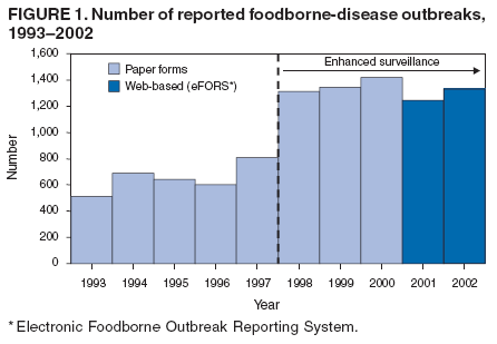 ResultsDuring 1998--2002, the annual number of reported outbreaks ranged from 1,243 to 1,417 (Tables 2--6). The average annual number of outbreaks reported during this period (1,329) was substantially greater than the average annual number of outbreaks reported during 1993--1997 (550) (Figure 1). The average number of cases per outbreak during 1998--2002 (19) was lower than the average number of cases per outbreak during 1993--1997 (31). During 1998--2002, a total of 2,167 (33%) of the 6,647 outbreaks reported to CDC had a known etiology; these outbreaks accounted for 68,981 (54%) of 128,370 illnesses (Table 1). Of the 2,167 outbreaks with a known etiology, 55% (55% of illnesses) were caused by bacterial pathogens, 33% (41% of illnesses) by viruses, 10% (2% of illnesses) by chemical agents, and 1% (1% of illnesses) by parasites. The proportion of outbreaks with known etiology attributable to viruses increased from 16% in 1998 to 42% in 2002. In the majority (67%) of outbreaks, the etiology was not determined. However, the proportion of outbreaks for which an etiology was determined increased during the reporting period, from 28% in 1998 to 37% in 2002. Local investigators might report factors they believe contributed to the outbreak. These factors are grouped into those that investigators believed led to contamination of the food, those that allowed proliferation of the pathogen in the food, and those that contributed to survival of the pathogen in the food. During 1998--2002, at least one contributing factor was reported in 3,072 (46%) outbreaks. The most commonly reported contamination factor that contributed to FBDOs was "bare-handed contact by handler/worker/preparer" (Table 19). For outbreaks caused by bacterial pathogens "raw product/ingredient contaminated by pathogens from animal or environment" was the most commonly reported contamination factor. The most commonly reported proliferation factor was "allowing foods to remain at room or warm outdoor temperature for several hours"; the most common survivability factor was "insufficient time and/or temperature during initial cooking/heat processing." In the majority of foodborne outbreaks during this period, food was eaten outside the home (Table 8). Restaurants were the most commonly reported place where food was eaten. Many outbreaks caused by Salmonella or norovirus occurred at a school or nursing home. In outbreaks caused by ciguatoxin and L. monocytogenes, food was more commonly reported to have been eaten at a private home. During this period, notable outbreaks were reported that were caused by ground beef contaminated with E. coli O157:H7 (9) and fresh produce contaminated with Salmonella, E. coli O157:H7, Cyclospora cayetanensis, or hepatitis A (Tables 14--18). Multidrug-resistant strains of Salmonella caused outbreaks linked to unpasteurized milk and ground beef. A large multistate outbreak of listeriosis caused by contaminated deli meat led to one of the largest food recalls in the United States (10). Scombrotoxin (fish-derived histaminic agent) caused the majority of outbreaks attributable to a chemical etiology. The majority of these outbreaks was associated with tuna, although several were associated with nonscombroidae fish, including 10 outbreaks associated with escolar. Unexpected vehicles of transmission (e.g., dry cereal [11], parsley [12], and mangoes [13]) also were reported. During 1998--2002, norovirus caused 657 (30%) of the 2,167 FBDOs with a known etiology and 39% of all outbreak-related cases in these outbreaks. S. Enteritidis, the most frequently reported bacterial cause of FBDOs, caused 204 outbreaks, accounting for 9% of outbreaks for which an etiology was determined. Eggs caused more S. Enteritidis outbreaks than any other food vehicle. L. monocytogenes resulted in 38 outbreak-related deaths among 256 cases, more deaths, and a higher case-fatality rate (15%) than any other pathogen. DiscussionFoodborne-Disease Outbreaks, 1998--2002The annual number of FBDOs reported to CDC increased during this period compared with previous years, following implementation of measures to enhance outbreak surveillance (3--5). Certain observations suggest that the increase in outbreak reports probably represents the effect of enhanced surveillance rather than a true increase in the occurrence of FBDOs. First, after a marked increase during 1997--1998 with implementation of enhanced surveillance, the number of reported outbreaks remained within a relatively narrow range. Second, the number of cases of foodborne infections identified through routine surveillance, of which outbreak cases are a part, decreased or remained stable during this period (14). Finally, the average size of reported outbreaks during 1998--2002 was smaller than the average size of outbreaks during 1993--1997, indicating that a substantial portion of the increase in reported outbreaks might be caused by smaller outbreaks that were not reported in previous years. Because of this increased reporting, comparisons of the number of reported FBDOs attributable to a specific etiology or vehicle of transmission between this period and previous reporting periods are difficult to make. Comparisons of the proportion of FBDOs related to specific causes are less likely to be influenced by the effect of enhanced surveillance but should be made with caution. As in previous years, bacterial pathogens caused the majority of outbreaks and infections among outbreaks with a known etiology (3--5). Viral pathogens accounted for a much greater proportion of outbreaks and infections than in previous years, probably because of the increased availability of methods to diagnose viral agents. Although 67% of reported FBDOs during 1998--2002 were of unknown etiology, the proportion of outbreaks of unknown etiology decreased during 1998--2002. Much of this decrease is attributed to increased norovirus diagnostic capacity in state health department laboratories (15) and improved strate