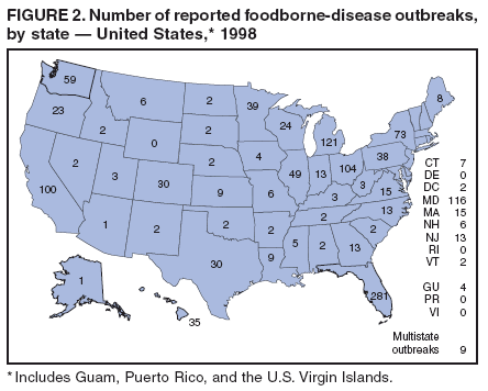 This report summarizes epidemiologic data on FBDOs reported to CDC during 1998--2002. MethodsSources of Data for the Foodborne Disease Outbreak Surveillance SystemAgencies use a standard form (CDC form 52.13, Investigation of a Foodborne Outbreak) to report FBDOs to CDC. In 1998, CDC increased communication with state, local, and territorial health departments to enhance surveillance for FBDOs, including formal confirmation procedures to finalize reports from each state each year. This led to a substantial increase in the number of reports, resulting in a surveillance discontinuity during 1997--1998. A revised form became effective in 1999. The revised form expanded the range of food items, places, and contributing factors that could be reported. In 2001, state, local, and territorial health departments began submitting reports through a web-based version of this form. This web-based outbreak surveillance system is called the Electronic Foodborne Outbreak Reporting System (eFORS). This report summarizes data collected with both the paper and web-based forms (Appendix A). The majority of reports are submitted by state, local, and territorial health departments; however, they also can be submitted by federal agencies and other sources. Reporting officials use published criteria to determine whether a specific etiologic agent has been confirmed for an outbreak (Appendix B) and submit reasons that reported food vehicles were implicated. Implicated food vehicles for all reasons are included in this report. Definition of TermsAn FBDO is defined as the occurrence of two or more cases of a similar illness resulting from the ingestion of a food in common. Laboratory or clinical guidelines for confirming an etiology of a FBDO outbreak vary for bacterial, chemical, parasitic, and viral agents (Appendix B). An outbreak in which more than one etiologic agent was confirmed is categorized as attributable to multiple etiologies. Food vehicles identified in outbreak investigations that can be classified into a single commodity are classified into one of 12 major food commodity categories. Some reported food vehicles cannot be categorized in a single commodity category and are listed as unclassifiable. Outbreaks in which more than one implicated food is reported or the implicated food contains ingredients from multiple commodities are classified as attributable to complex food vehicles. Exclusions from and Limitations of the Surveillance SystemThe findings in this report are subject to at least four limitations. First, several types of outbreaks are excluded from the Foodborne Disease Outbreak Surveillance System, such as outbreaks that occur on cruise ships (these are summarized and published periodically in scientific publications) (6); outbreaks in which the food was eaten outside the United States, even if the illness occurred within the United States; and outbreaks that are traced to water intended for drinking (these are reported to the Waterborne Disease Outbreak Reporting System). In addition, FBDOs are excluded from the surveillance system if the route of transmission from the contaminated food to the infected persons is indirect. For example, in 1988, chitterlings (pig intestines) were the ultimate source of a cluster of Yersinia enterocolitica infections among several infants; however, this outbreak was not included because the infants did not eat the chitterlings (7). Similarly, outbreaks that occur as result of direct contact with animals are excluded. Second, for many reports, information on certain aspects of the outbreak, such as the etiology, the implicated food vehicle, or the factors that might have contributed to the outbreak, is missing or incomplete. The category of "unknown etiology" is broad. Outbreaks with some etiologic information might not meet guidelines for confirmation and are presented in this report as "unknown etiology." Clinical and descriptive epidemiologic information that suggests etiologic categories for outbreaks of unknown etiology have not been used in this report (8). Third, food vehicles are reported by investigating agencies as individual food items in varying levels of details (e.g., milk, 2% milk, pasteurized 2% milk). A particular reported food item with multiple ingredients could be classified under several food commodity categories; however, in this surveillance summary, the reported food item for each outbreak is classified under only one food commodity category. Food items that cannot be classified under one food commodity category are counted as unclassifiable. As a result, the reported number of outbreaks attributed to one food vehicle category might not include all outbreaks attributable to a particular food ingredient in that food. Finally, no standard criteria exist for classifying a death as being FBDO-related. This determination is made by the reporting agency. How Data Are PresentedIn this report, 1998--2002 data on foodborne-disease outbreaks are presented as follows: