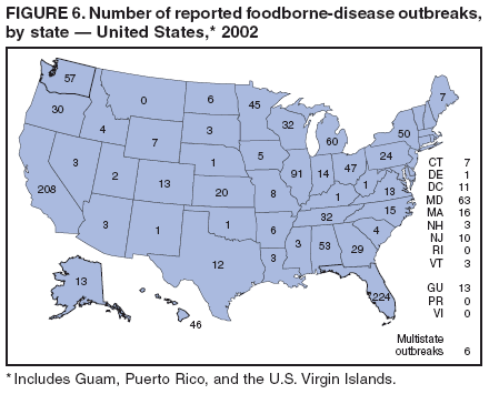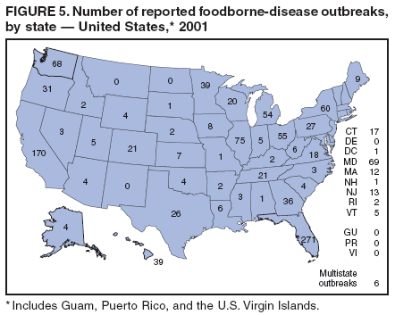 Corresponding author: Michael Lynch, MD, Division of Foodborne, Bacterial, and Mycotic Diseases, National Center for Zoonotic, Vector-Borne, and Enteric Diseases (proposed), 1600 Clifton Road, NE, MS A-38, Atlanta, GA 30333. Telephone: 404-639-2206; Fax: 404-639-2205; E-mail: mlynch1@cdc.gov. AbstractProblem/Condition: Since 1973, CDC has maintained a collaborative surveillance program for collection and periodic reporting of data on the occurrence and causes of foodborne-disease outbreaks (FBDOs) in the United States. Reporting Period Covered: 1998--2002. Description of System: The Foodborne Disease Outbreak Surveillance System reviews data on FBDOs, defined as the occurrence of two or more cases of a similar illness resulting from the ingestion of a common food. State and local public health departments have primary responsibility for identifying and investigating FBDOs. State, local, and territorial health departments use a standard form to report these outbreaks to CDC. In 1998, CDC implemented enhanced surveillance for FBDOs by increasing communication with state, local, and territorial health departments and revising the outbreak report form. Since 2001, reports of FBDOs are submitted through a web application on the Internet called the electronic Foodborne Outbreak Reporting System (eFORS). Results: During 1998--2002, a total of 6,647 outbreaks of foodborne disease were reported (1,314 in 1998, 1,343 in 1999, 1,417 in 2000, 1,243 in 2001, and 1,330 in 2002). These outbreaks caused a reported 128,370 persons to become ill. Among 2,167 (33%) outbreaks for which the etiology was determined, bacterial pathogens caused the largest percentage of outbreaks (55%) and the largest percentage of cases (55%). Among bacterial pathogens, Salmonella serotype Enteritidis accounted for the largest number of outbreaks and outbreak-related cases; Listeria monocytogenes accounted for the majority of deaths of any pathogen. Viral pathogens, predominantly norovirus, caused 33% of outbreaks and 41% of cases; the proportion of outbreaks attributed to viral agents increased from 16% in 1998 to 42% in 2002. Chemical agents caused 10% of outbreaks and 2% of cases, and parasites caused 1% of outbreaks and 1% of cases. Interpretation: Following implementation of measures to enhance outbreak surveillance, the annual number of FBDOs reported to CDC increased during this period compared with previous years. Viral pathogens accounted for an increased proportion of outbreaks each year during this reporting period and a higher proportion of outbreaks of known etiology during this reporting period than preceding reporting periods, probably reflecting the increased availability of improved viral diagnostic tests. S. Enteritidis continued to be a major cause of illness and L. monocytogenes was a major cause of death. In addition, multistate outbreaks caused by contaminated produce and outbreaks caused by Escherichia coli O157:H7 remained prominent. Public Health Actions: Methods to detect FBDOs are improving, and several changes to improve the ease and timeliness of reporting FBDO data have been implemented (e.g., a revised form to simplify FBDO reporting by state health departments and improved electronic reporting methods). State and local health departments continue to investigate and report FBDOs as part of efforts to better understand and define the epidemiology of foodborne disease in the United States. At the regional and national levels, surveillance data provide an indication of the etiologic agents, vehicles of transmission, and contributing factors associated with FBDOs and help direct public health actions to reduce illness and death caused by FBDOs. IntroductionThe reporting of foodborne and waterborne diseases in the United States began approximately 80 years ago when state and territorial health officers, concerned about the high morbidity and mortality caused by typhoid fever and infantile diarrhea, recommended that cases of "enteric fever" be investigated and reported. The purpose of investigating and reporting these cases was to obtain information about the role of food, milk, and water in outbreaks of intestinal illness as the basis for public health action. Beginning in 1925, the U.S. Public Health Service (PHS) published summaries of outbreaks of gastrointestinal illness attributed to milk (1). In 1938, PHS added summaries of outbreaks caused by all foods. These early surveillance efforts led to the enactment of important public health measures (e.g., the Pasteurized Milk Ordinance) that resulted in decreased incidence of enteric diseases, particularly those transmitted by milk and water (2). During 1951--1960, the National Office of Vital Statistics reviewed reports of outbreaks of foodborne illness and published annual summaries in Public Health Reports. In 1961, CDC assumed responsibility for publishing reports about foodborne illness. During 1961--1965, CDC stopped publishing annual reviews but reported pertinent statistics and detailed individual investigations in MMWR. The current system of surveillance for outbreaks of foodborne and waterborne diseases began in 1966, when reports of enteric disease outbreaks attributed to microbial or chemical contamination of food or water were incorporated into an annual summary. Since 1966, the quality of investigative reports has improved greatly, with more active participation by state and federal epidemiologists in outbreak investigations. Outbreaks of waterborne diseases and foodborne diseases have been reported in separate annual summaries since 1978 because of increased interest and activity in surveillance for waterborne diseases. Previous summaries of data reported to the Foodborne Disease Outbreak Surveillance System were published for 1983--1987 (3), 1988--1992 (4), and 1993--1997 (5). Outbreak surveillance has served three purposes: