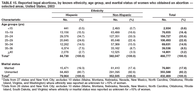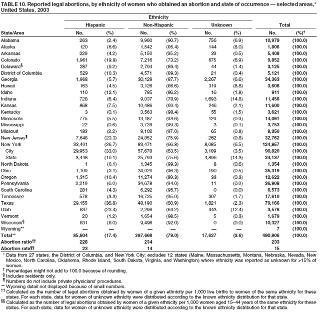 * Includes state, DC, and NYC health departments. Wyoming reported seven abortions in 2003. As a result of the small number and because computing abortion ratios and rates for such a limited number is not appropriate, Wyoming was not included in this sequence in the text. § Ratios for adolescents aged <15 years differ in Tables 4 and 5 because a different number of areas reported; Table 4 includes 48 reporting areas, and Table 5 includes 46. ¶ Medical (nonsurgical) abortion procedures involve the administration of a medication or medications to induce abortion. ** After exclusion of 12 areas in which ethnicity data were unknown for >15% of women who obtained an abortion. Table 1