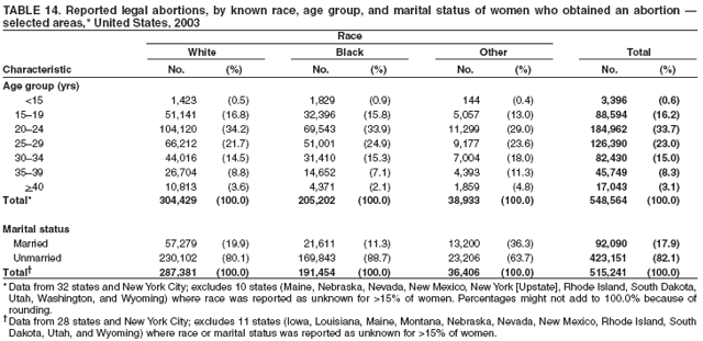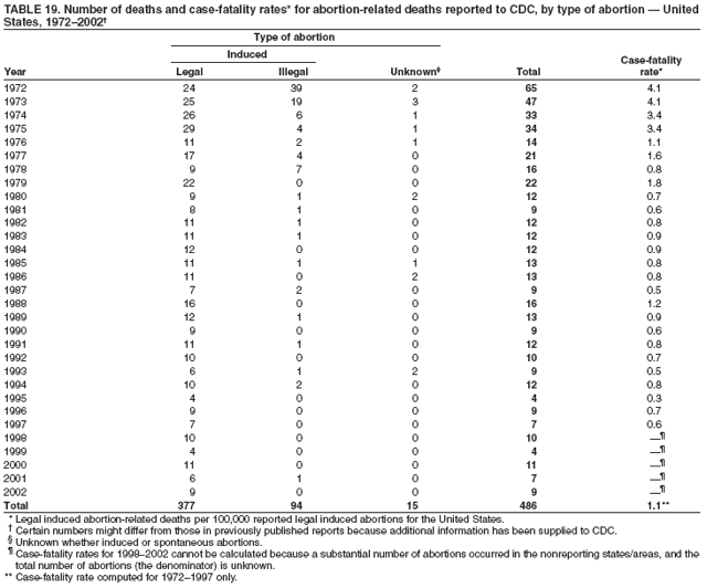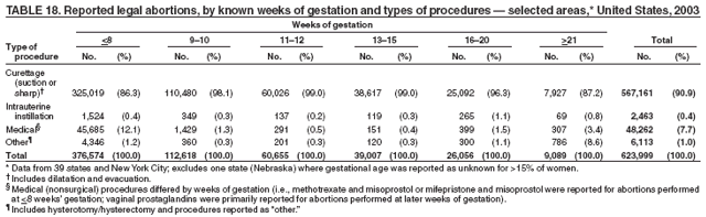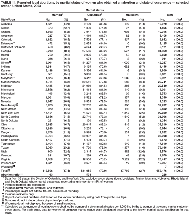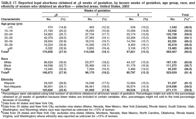 Corresponding address: CDC/National Center for Chronic Disease Prevention and Health Promotion/Division of Reproductive Health, 1600 Clifton Rd., N.E., MS K-21, Atlanta, GA 30333. E-mail: cdcinfo@cdc.gov. AbstractProblem/Condition: CDC began abortion surveillance in 1969 to document the number and characteristics of women obtaining legal induced abortions. Reporting Period Covered: This report summarizes and describes data voluntarily reported to CDC regarding legal induced abortions obtained in the United States in 2003. Description of System: For each year since 1969, CDC has compiled abortion data by state or area of occurrence. During 1973--1997, data were received from or estimated for 52 reporting areas in the United States: 50 states, the District of Columbia, and New York City. In 1998 and 1999, CDC compiled abortion data from 48 reporting areas. Alaska, California, New Hampshire, and Oklahoma did not report, and data for these states were not estimated. During 2000--2002, Oklahoma again reported these data, increasing the number of reporting areas to 49, and for 2003, Alaska again reported and West Virginia did not, maintaining the number of reporting areas at 49. Results: A total of 848,163 legal induced abortions were reported to CDC for 2003 from 49 reporting areas, representing a 0.7% decline from the 854,122 legal induced abortions reported by 49 reporting areas for 2002. The abortion ratio, defined as the number of abortions per 1,000 live births, was 241 in 2003, a decrease from the 246 in 2002. The abortion rate was 16 per 1,000 women aged 15--44 years for 2003, the same as for 2002. For the same 47 reporting areas, the abortion rate remained relatively constant during 1998--2003. During 2001--2002 (the most recent years for which data are available), 15 women died as a result of complications from known legal induced abortion. One death was associated with known illegal abortion. The highest percentages of reported abortions were for women who were unmarried (82%), white (55%), and aged <25 years (51%). Of all abortions for which gestational age was reported, 61% were performed at <8 weeks' gestation and 88% at <13 weeks. From 1992 (when detailed data regarding early abortions were first collected) through 2002, steady increases have occurred in the percentage of abortions performed at <6 weeks' gestation, with a slight decline in 2003. A limited number of abortions were obtained at >15 weeks' gestation, including 4.2% at 16--20 weeks and 1.4% at >21 weeks. A total of 36 reporting areas submitted data documenting that they performed and enumerated medical (nonsurgical) procedures, making up 8.0% of all known reported procedures from the 45 areas with adequate reporting on type of procedure. Interpretation: During 1990--1997, the number of legal induced abortions gradually declined. When the same 47 reporting areas are compared, the number of abortions decreased during 1996--2001, then slightly increased in 2002 and again decreased in 2003. In 2000 and 2001, even with one additional reporting state, the number of abortions declined slightly, with a minimal increase in 2002 and a further decrease in 2003. In 2001 and 2002, as in the previous years, deaths related to legal induced abortions occurred rarely. Public Health Action: Abortion surveillance in the United States continues to provide the data necessary for examining trends in numbers and characteristics of women who obtain legal induced abortions and to increase understanding of this pregnancy outcome. Policymakers and program planners use these data to improve the health and well-being of women and infants. IntroductionCDC began conducting abortion surveillance in 1969 to document the number and characteristics of women obtaining legal induced abortions. This report is based on abortion data for 2003, provided voluntarily to CDC's National Center for Chronic Disease Prevention and Health Promotion (NCCDPHP), Division of Reproductive Health. MethodsFor 2003, CDC compiled data that were voluntarily provided from 49 reporting areas in the United States: 47 states (excluding California, New Hampshire, and West Virginia), the District of Columbia (DC), and New York City (NYC). Legal induced abortion was defined as a procedure, performed by a licensed physician or someone acting under the supervision of a licensed physician, that was intended to terminate a suspected or known intrauterine pregnancy and to produce a nonviable fetus at any gestational age (1,2). The total number of legal induced abortions was available from all reporting areas; however, not all of these areas collected data on some or all characteristics of women who obtained abortions, and the availability of such data varied by reporting area. Data on the age of women who obtained abortions were collected and reported adequately (i.e., categorized in accordance with surveillance variables and with <15% of unknown values) by 48 reporting areas (46 states [excluding California, Florida, New Hampshire, and West Virginia], DC, and NYC), representing 89% of all reported procedures, whereas data on ethnicity were collected and reported adequately by only 29 reporting areas, representing 58% of all reported procedures. The findings in this report reflect characteristics of women only from reporting areas that submitted adequate data for the characteristics being examined. For the majority of the state tables presented in this report, the percentage data include a category for unknown values, and the percentage known to be in each category is actually a slight understatement of the true percentage in that category (by its share of the unknown value). However, for trend data, out-of-area residents, adolescent ages, and two-characteristics tables, percentages presented are based on known values only. For the 49 reporting areas, data concerning the number of women who obtained legal induced abortions were provided by the central health agency.* These agencies prov