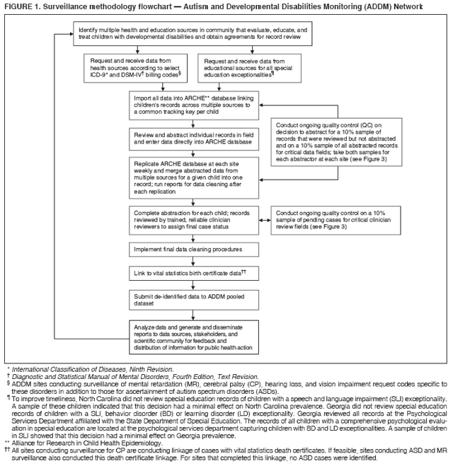 Corresponding author: Kim Van Naarden Braun, PhD, Division of Birth Defects and Developmental Disabilities, National Center on Birth Defects and Developmental Disabilities, CDC, 1600 Clifton Road, N.E., MS E-86, Atlanta, GA 30333. Telephone: 404-498-3860; Fax: 404-498-3550; E-mail: kbn5@cdc.gov. AbstractProblem: Autism spectrum disorders (ASDs) encompass a spectrum of conditions, including autistic disorder; pervasive developmental disorders, not otherwise specified (PDD-NOS); and Asperger disorder. Impairments associated with ASDs can range from mild to severe. In 2000, in response to increasing public heath concern regarding ASDs, CDC established the Autism and Developmental Disabilities Monitoring (ADDM) Network. The primary objective of this ongoing surveillance system is to track the prevalence and characteristics of ASDs in the United States. ADDM data are useful to understand the prevalence of ASDs and have implications for improved identification, health and education service planning, and intervention for children with ASDs. Because complete, valid, timely, and representative prevalence estimates are essential to inform public health responses to ASDs, evaluating the effectiveness and efficiency of the ADDM methodology is needed to determine how well these methods meet the network's objective. Reporting Period: 2002. Description of System: The ADDM Network is a multiple-source, population-based, active system for monitoring ASDs and other developmental disabilities. In 2002, data were collected from 14 collaborative sites. This report describes an evaluation conducted using guidelines established by CDC for evaluating public health surveillance systems and is based on examination of the following characteristics of the ADDM Network surveillance system: simplicity, flexibility, data quality, acceptability, representativeness, sensitivity, predictive value positive (PVP), timeliness, stability, data confidentiality and security, and sources of variability. Results and Interpretation: Using multiple sources for case ascertainment strengthens the system's representativeness, sensitivity, and flexibility, and the clinician review process aims to bolster PVP. Sensitivity and PVP are difficult to measure, but the ADDM methodology provides the best possible estimate currently available of prevalence of ASDs without conducting complete population screening and diagnostic clinical case confirmation. Although the system is dependent on the quality and availability of information in evaluation records, extensive quality control and data cleaning protocols and missing records assessments ensure the most accurate reflection of the records reviewed. Maintaining timeliness remains a challenge with this complex methodology, and continuous effort is needed to improve timeliness and simplicity without sacrificing data quality. The most difficult influences to assess are the effects of changes in diagnostic and treatment practices, service provision, and community awareness. Information sharing through education and outreach with site-specific stakeholders is the best mechanism for understanding the current climate in the community with respect to changes in service provision and public policy related to ASDs, which can affect prevalence estimates. Public Health Actions: These evaluation results and descriptions can be used to help interpret the ADDM Network 2002 surveillance year data and can serve as a model for other public health surveillance systems, especially those designed to monitor the prevalence of complex disorders. IntroductionAutism spectrum disorders (ASDs) encompass a spectrum of conditions, including autistic disorder; pervasive developmental disorders not otherwise specified (PDD-NOS); and Asperger disorder. Impairments associated with ASDs can range from mild to severe. ASDs are of increasing public health concern because the number of children receiving services for these conditions is growing. Despite the need to understand ASDs better, few data are available concerning the prevalence, characteristics, and trends of these conditions. In 2000, CDC established the Autism and Developmental Disabilities Monitoring (ADDM) Network to track the prevalence and characteristics of ASDs in the United States. The ADDM network is a multiple-source, active, population-based surveillance system that reviews developmental records at educational and health sources and employs a standardized case algorithm to identify ASD cases. ADDM data are useful to understand the prevalence of ASDs and can promote improved identification, health and education service planning, and intervention for children with ASDs. Complete, valid, timely, and representative prevalence estimates are essential to inform public health responses to ASDs. Evaluation of the effectiveness and efficiency of the ADDM methodology, described in detail elsewhere (1), is necessary to understand how well the methods meet the network's objective. This report examines the ADDM Network methodology employed by 14 collaborative sites that collected data for the 2002 surveillance year and evaluates the validity and completeness of prevalence estimates and the effect of sources of variability on intersite prevalence differences. This evaluation was conducted using guidelines established by CDC for evaluating public health surveillance systems and includes examination of the following characteristics of the ADDM Network surveillance system, including simplicity, flexibility, data quality, acceptability, representativeness, predictive value positive, sensitivity, timeliness, stability, data confidentiality and security, and sources of variability (2). SimplicityThe simplicity of a public health surveillance system refers to both its structure and ease of operation. The simplicity of an autism surveillance system is limited by the variability of ASD signs and symptoms and methods of diagnosis (3,4). Impairments associated with ASDs can range fro