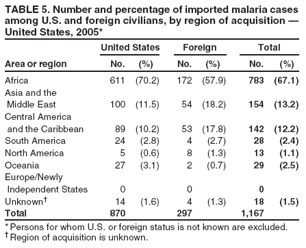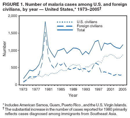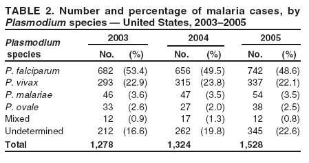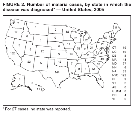 Corresponding author: Julie I. Thwing, MD, Division of Parasitic Diseases, National Center for Zoonotic, Vectorborne, and Enteric Diseases, 4770 Buford Hwy., N.E., MS F-22, Atlanta, GA 30341. Telephone: 770-488-7745; Fax: 770-488-4206; E-mail: fez3@cdc.gov. AbstractProblem/Condition: Malaria in humans is caused by any of four species of intraerythrocytic protozoa of the genus Plasmodium (i.e., P. falciparum, P. vivax, P. ovale, or P. malariae). These parasites are transmitted by the bite of an infective female Anopheles sp. mosquito. The majority of malaria infections in the United States occur among persons who have traveled to or from areas with ongoing malaria transmission. In the United States, cases can occur through exposure to infected blood products, congenital transmission, or local mosquitoborne transmission. Malaria surveillance is conducted to identify episodes of local transmission and to guide prevention recommendations for travelers. Period Covered: This report summarizes cases in persons with onset of illness in 2005 and summarizes trends during previous years. Description of System: Malaria cases confirmed by blood film or polymerase chain reaction (PCR) are mandated to be reported to local and state health departments by health-care providers or laboratory staff. Case investigations are conducted by local and state health departments, and reports are transmitted to CDC through the National Malaria Surveillance System (NMSS). Data from NMSS serve as the basis for this report. Results: CDC received reports of 1,528 cases of malaria, including seven fatal cases, with an onset of symptoms in 2005 among persons in the United States or one of its territories. This number represents an increase of 15.4% from the 1,324 cases reported for 2004. P. falciparum, P. vivax, P. malariae, and P. ovale were identified in 48.6%, 22.1%, 3.5%, and 2.5% of cases, respectively. Twelve patients (0.8% of total) were infected by two or more species. The infecting species was unreported or undetermined in 22.6% of cases. Compared with 2004, the largest increases in cases came from the Americas (23.1%; n = 213) and Asia and the Middle East (18.6%; n = 204). On the basis of estimated volume of travel, the highest estimated case rates of malaria among travelers occurred among those returning from West Africa. Of 870 U.S. civilians who acquired malaria abroad, only 160 (18.4%) reported that they had followed a chemoprophylactic drug regimen recommended by CDC for the area to which they had traveled. Two patients became infected in the United States, both attributed to congenital transmission; both were infected with P. vivax. Seven deaths were attributed to malaria, all caused by infection with P. falciparum. Interpretation: The 15.4% increase in malaria cases in 2005, compared with 2004, resulted primarily from increases in the number of cases reported from Asia and the Middle East and from the Americas. This increase might in part reflect more complete reporting and in part increased travel to malarious areas. No change was noted in proportions of cases from other areas of the world, or in species responsible for the infection. In the majority of reported cases, U.S. civilians who acquired infection abroad had not adhered to a chemoprophylaxis regimen that was appropriate for the country in which they acquired malaria. U.S. civilians who traveled to West Africa had the highest estimated relative case rate. Public Health Actions: Additional investigations were conducted for the seven fatal cases and two infections acquired in the United States. Persons traveling to a malarious area should take one of the recommended chemoprophylaxis regimens appropriate for the region of travel and use personal protection measures to prevent mosquito bites. Any person who has been to a malarious area and who subsequently has a fever or influenza-like symptoms should seek medical care immediately and report their travel history to the clinician; investigation should include at least one blood-film test for malaria. Malaria infections can be fatal if not diagnosed and treated promptly. Recommendations concerning malaria prevention can be obtained from CDC at http://www.cdc.gov/travel or by calling the Malaria Hotline (telephone 770-488-7788). Recommendations for malaria treatment can be obtained at http://www.cdc.gov/malaria/diagnosis_treatment/treatment.htm or by calling the Malaria Hotline. IntroductionMalaria in humans is caused by infection with one or more of four species of Plasmodium (i.e., P. falciparum, P. vivax, P. ovale, and P. malariae) that can infect humans. Other Plasmodium species infect animals. The infection is transmitted by the bite of an infective female Anopheles sp. mosquito. Malaria remains a devastating global problem, with an estimated 350--500* million cases occurring annually (1). Forty-nine percent of the world's population lives in areas where malaria is transmitted (e.g., parts of Africa, Asia, the Middle East, Eastern Europe, Central and South America, Hispaniola, and Oceania), and approximately 1 million persons die from malaria each year, 80% of them in sub-Saharan Africa (1). Before the 1950s, malaria was endemic throughout the southeastern United States; an estimated 600,000 cases occurred in 1914 (2). During the late 1940s, a combination of improved housing and socioeconomic conditions, water management, vector-control efforts, and case management was successful at interrupting malaria transmission in the United States. Since then, malaria case surveillance has been maintained to detect locally acquired cases that could indicate the reintroduction of transmission and to monitor patterns of resistance to antimalarial drugs. Anopheline mosquitoes remain seasonally present in all states except Hawaii. The majority of reported cases of malaria diagnosed each year in the United States and U.S. territories are imported from regions where malaria transmission is known to occur, although 