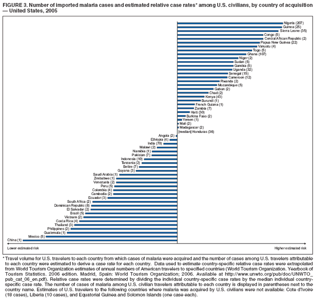 Laboratory Diagnosis of MalariaThe early and prompt diagnosis of malaria requires that physicians obtain a travel history from every febrile patient. Malaria should be included in the differential diagnosis of every febrile patient who has traveled to a malarious area. If malaria is suspected, a Giemsa-stained film of the patient's peripheral blood should be examined for parasites. Thick and thin blood films must be prepared correctly because diagnostic accuracy depends on blood-film quality and examination by experienced laboratory personnel (Appendix). Select reference laboratories and health departments have the capacity to perform PCR diagnosis of malaria, although this usually is reserved for cases for which blood-film diagnosis of malaria or species determination is inadequate. ResultsGeneral SurveillanceFor 2005, CDC received 1,528 reports of cases of malaria occurring among persons in the United States and its territories, representing a 15.4% increase from the 1,324 cases reported with a date of onset in 2004 (8; Table 1). In 2005, a total of 870 cases occurred among U.S. civilians and 297 cases among foreign civilians (Table 1). Since 2003, the number of cases among U.S. civilians has been increasing (Figure 1). Plasmodium SpeciesOf the 1,528 cases reported in 2005, the infecting species of Plasmodium was identified in 1,183 (77.4%) cases. P. falciparum and P. vivax were identified in blood films from 48.6% and 22.1% of infected persons, respectively (Table 2). The number of reported cases of P. falciparum increased 13.1%, from 656 in 2004 to 742 in 2005, and the number of P. vivax infections increased 7.0%, from 315 to 337. Among 1,081 cases for which both the region of acquisition and the infecting species were known, 83.4% of infections acquired in Africa were attributed to P. falciparum and 6.6% to P. vivax. The converse was true for infections acquired in the Americas and in Asia and the Middle East; 59.1% and 68.1%, respectively, were attributed to P. vivax and 33.9% and 13.2% to P. falciparum. Region of Acquisition and DiagnosisAll but two reported cases were imported. Of 1,349 imported cases for which the region of acquisition was known, 902 (66.9%) were acquired in Africa, 204 (15.1%) in Asia and the Middle East, and 213 (15.8%) in the Americas (Table 3). A total of 30 (2.0%) imported cases were acquired in Oceania. West Africa accounted for 619 (68.6%) cases acquired in Africa, and India accounted for 137 (67.2%) cases acquired in Asia and the Middle East. In the Americas, 162 (76.0%) cases were acquired in Central America and the Caribbean, followed by 37 (17.3%) cases in South America and 14 (6.6%) cases in Mexico. Information regarding region of acquisition was missing for 177 (11.6%) imported cases. Compared with 2004, the number of reported malaria cases acquired in the Americas increased 23.1% (n = 213), the number acquired in Asia and the Middle East increased 18.6% (n = 204), and the number acquired in Africa increased 11.5% (n = 902). In the United States, the six health departments reporting the highest number of malaria cases were New York City (n = 192), California (n = 162), Texas (n = 144), Maryland (n = 97), New Jersey (n = 83), and Illinois (n = 79) (Figure 2). Of these, New York City was the only health department to report a decrease in the number of cases compared with 2004; all of the others in the top 6 reported increases. Relative Case Rates in U.S. CiviliansIn 2005, the countries with the lowest and highest estimated case rates of malaria among U.S. travelers were China and Nigeria, respectively (Figure 3). Other countries with low estimated relative case rates included Mexico, Thailand, Costa Rica, and South Africa. For many of these countries, malaria risk areas are focally located in small parts of the country. Countries with estimated relative case rates that fell in the middle range included India, Honduras, and Haiti, which had malaria transmission occurring more homogenously throughout the country. Estimated relative case rates were highest in countries in West and Central Africa, including Nigeria and Ghana, but also in two countries in Oceania: Vanuatu and Papua New Guinea. These high estimated case rates probably reflect not only widespread transmission areas but also higher transmission intensity. Interval Between Arrival and IllnessBoth the interval between date of arrival in the United States and onset of illness and the infecting Plasmodium species were known for 668 (43.7%) of the imported malaria cases (Table 4). Symptoms began before arrival in the United States for 81 (12.1%) persons and after arrival for 587 (87.9%) persons. Clinical malaria occurred <30 days after arrival in 380 (81.0%) of the 469 P. falciparum cases and in 61 (40.7%) of the 150 P. vivax cases (Table 4). Five (0.7%) of 668 persons became ill >1 year after returning to the United States. Imported Malaria CasesImported Malaria Among U.S. Military Personnel In 2005, a total of 36 cases of imported malaria were reported among U.S. military personnel, 30 of whom acquired malaria in Asia and the Middle East. These cases were reported by state health departments and might not include all cases reported through malaria surveillance activities conducted by the U.S. Department of Defense. Of the 32 patients for whom information regarding chemoprophylaxis use was available, 21 (65.6%) reported taking the correct prophylaxis, nine (28.1%) were not using any chemoprophylaxis, and two (6.3%) had adhered to an incorrect regimen. Imported Malaria Among Civilians Of 1,167 imported malaria cases reported among civilians, 870 (74.6%) occurred among U.S. residents and 297 (25.4%) among residents of other countries (Table 5). Of the 870 imported malaria cases among U.S. civilians, 611 (70.2%) were acquired in Africa, 100 (11.5%) were acquired in Asia and the Middle East, and 89 (10.2%) were acquired in the Central American and Caribbean regions; these percentages remained stable 