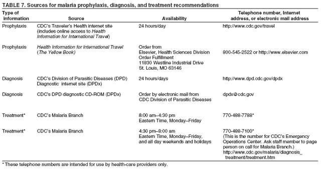 * The en dash in numeric ranges is used to represent inclusive hours, days, ages, dosages, or a sequence of numbered items. To obtain confirmation diagnosis of blood films from questionable cases and to obtain appropriate treatment recommendations, contact either your state or local health department or CDC's National Center for Zoonotic, Vector-Borne, and Enteric Diseases, Division of Parasitic Diseases, Malaria Branch at 770-488-7788. Table 1