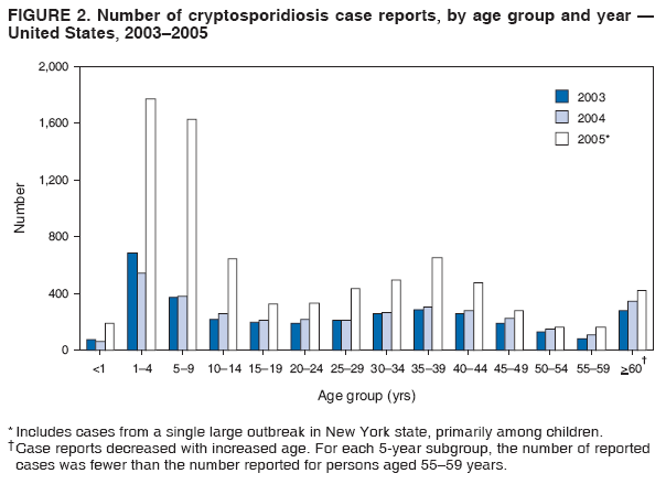 A probable case of cryptosporidiosis is a clinically compatible case that is linked epidemiologically to a confirmed case. Because the case definition used by CDC does not include probable cases (36), certain states or areas report only confirmed cases of cryptosporidiosis. However, certain jurisdictions also report probable cases. A discussion has been initiated with partners regarding adding probable cases to the case definition. This surveillance summary includes both confirmed and probable cases as reported by jurisdictions. Testing for Cryptosporidium is not always included in routine examination of stool for ova and parasites (1). Commercially available immunoassay kits are available and might be more sensitive and specific than routine microscopic examination. DFA is an extremely sensitive and specific detection method and is considered the "gold standard" by many laboratorians; other immunodiagnostic kits that do not require microscopy (e.g., EIA and rapid immunochromatographic cartridge assays) also are available (38). Rapid immunoassays do not take the place of routine ova and parasite examination but might be useful in diagnosing Cryptosporidium infections. Only molecular testing (e.g., polymerase chain reaction) can be used to speciate Cryptosporidium; however, no species data are reported to CDC. State, District of Columbia (DC), and New York City (NYC) health department jurisdictions voluntarily report cases of cryptosporidiosis to CDC through the National Notifiable Diseases Surveillance System (NNDSS). Reports include the patient's place of residence (i.e., state and county), age, sex, race, ethnicity (i.e., Hispanic or non-Hispanic) and date of illness onset and indicate whether the case is linked to a known outbreak. An outbreak-related case is a laboratory-confirmed or probable case that is linked epidemiologically to at least one laboratory-confirmed case. Before analysis, these surveillance data were verified for accuracy by the reporting source and were finalized as of February 16, 2007. Because this surveillance summary includes probable cases of cryptosporidiosis and the data were finalized by the reporting jurisdiction more recently, the number of cases might differ slightly from the number reported in CDC's annual Summary of Notifiable Diseases. Analysis of national cryptosporidiosis surveillance data for 2003--2005 was conducted using SAS® v.9.1 (SAS Institute Inc.; Cary, North Carolina) and the Food Safety Information Link (FSI Link). FSI Link is an intranet-based tool available to CDC staff that provides access to NNDSS data and is used to monitor trends in, and investigate outbreaks of, reportable foodborne and waterborne diseases. Population data from the U.S. Census Bureau were used to calculate incidence rates. ResultsDuring 2003--2005, the total number of reported cases of cryptosporidiosis increased 11.6%, from 3,505 for 2003 to 3,911 for 2004, and then increased 111.4% to 8,269 for 2005 (Table 1). Cases reported to be outbreak related ranged from 6.6% of all cases reported for 2003 to 41.7% of all cases reported for 2005 (Table 1). All jurisdictions reported cryptosporidiosis cases during the reporting period, and the number of jurisdictions reporting more than four cases per 100,000 population increased from five in 2003 to seven in 2005 (Table 1). For 2005, incidence of cryptosporidiosis per 100,000 population ranged from 0.1 cases (in multiple states) to 18.2 cases (in New York), with 12 jurisdictions reporting >2.5 cases per 100,000 population (Figure 1; Table 1). The higher incidence of cryptosporidiosis in New York was influenced by a single large outbreak among >3,000 persons. Increased reporting of cases occurred in northern states. These surveillance data display a bimodal age distribution, with the greatest number of reported cases occurring among children aged 1--9 years and among adults aged 30--39 years (Figure 2). Increased reporting among younger children in 2005 was influenced by reporting of a single large outbreak in New York that comprised many probable cases. When reports for which a patient's sex was unknown or missing are excluded, the percentage of cases reported to have occurred among males varied annually from 49.6% (4,069 of 8,197) for 2005 to 55.9% (1,919 of 3,430) for 2003 (Table 2). A tenfold increase in reported cryptosporidiosis cases by illness onset date occurred during June--October compared with January--March (Figure 3). Age-specific analysis indicated that the seasonality in onset of illness was exhibited across all age groups, particularly among children aged 1--4 and 5--9 years (Figure 4). The majority of cases for which data on race were available for 2003--2005 occurred among whites, followed by blacks, Asians/Pacific Islanders, and American Indians/Alaska Natives (Table 2). However, data on race were lacking for 28.3%--47.1% of total annual case reports. Of patients for whom data on ethnicity were reported, 10.5%--11.5% were reported to be Hispanic (Table 2). However, data on ethnicity were lacking for 41.0%--60.9% of total annual case reports for 2003--2005. DiscussionNational cryptosporidiosis surveillance data are used to assess the epidemiologic characteristics and disease burden of cryptosporidiosis in the United States. The total number of cases reported annually increased during 2003--2005. Whether this increase reflects changes in reporting patterns and diagnostic testing practices or a real change in infection and disease caused by Cryptosporidium is unclear but was clearly influenced by outbreak-related case reporting. Outbreak-related probable case reporting does not account for the entire increase in reporting (Figure 5). This increase also follows the introduction of nitazoxanide, the first licensed treatment for the disease (4). Nitazoxanide was licensed in 2002 for children aged 1--11 years and in 2004 for children aged >11 years and adults. This drug introduction might have affected clinical pr