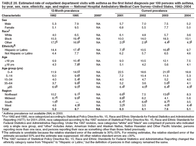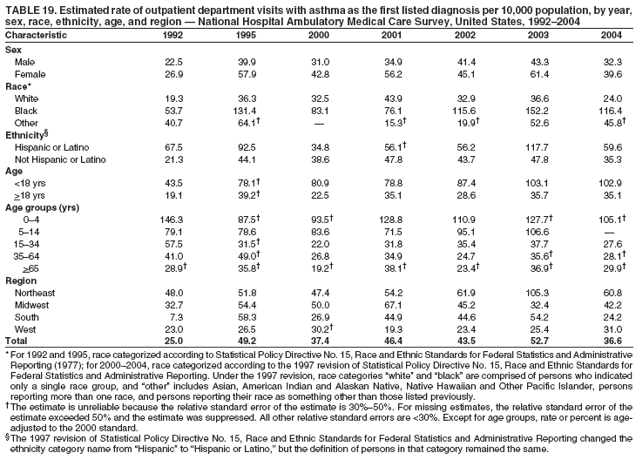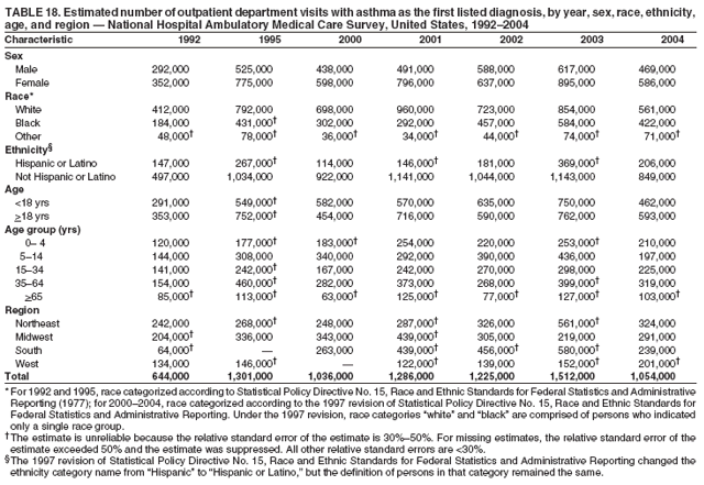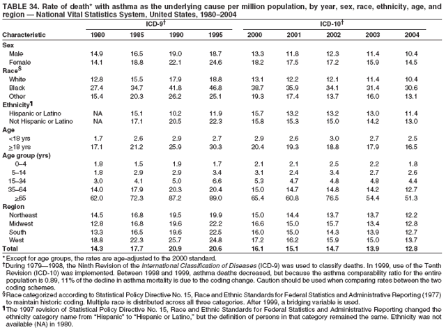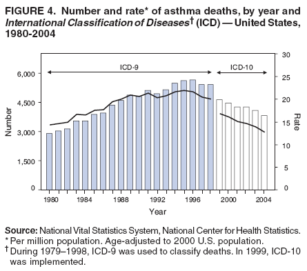 LimitationsBecause no definitive laboratory test for asthma exists, differentiating asthma from other chronic obstructive pulmonary diseases is challenging. To provide some guidance for consistency across asthma studies, in 1998, the Council of State and Territorial Epidemiologists developed a case definition for asthma surveillance that established a framework on the basis of three distinct data sources: administrative databases, survey self-response, and medical records (33). Most of the asthma estimates in this report relied on the physician accurately diagnosing asthma. In addition to the diagnostic challenge, other data-related concerns included conveying the diagnosis to the patient, patient recall of the diagnosis, documenting asthma in patient records, and coding of asthma related events. Asthma estimates for mortality relied on the physician accurately attributing the death to asthma. Some of the data sources used in asthma surveillance (e.g., emergency department visits) are administrative in nature and were originally intended for billing purposes. These data might be influenced by third-party reimbursement practices. In addition, the asthma prevalence measures used in this report relied on self-reported survey data that required individual recall of the physician's diagnosis. The validity of self-reported asthma status in these data is unknown. Either the physician's diagnosis or the patient's recall of that diagnosis might be inaccurate. However, a 1993 review of asthma questionnaires documented a mean sensitivity of 68% (range: 48%--100%) and a mean specificity of 94% (range: 78%--100%) when self-reported asthma was compared with a physician's clinical diagnosis of asthma (34). Additional limitations associated with survey data include declining response rates, reliability of self-reported information, and the exclusion of households without telephones and the institutionalized population. The reliability of death certificate data for asthma has been questioned. Asthma mortality rates for older age groups have been assumed to be unreliable because of misreporting the cause of death in older persons with comorbid medical conditions. This assumption is often cited as the reason for limiting asthma analysis and research to persons in younger age groups. Certain studies have supported the assumption that coding asthma as the underlying cause of death results in an overestimation of the number of deaths from asthma in the elderly (35--43). However, a majority of these studies were conducted in countries where asthma mortality rates far exceed that in the United States; studies based within the United States were small and included very limited populations. In contrast, a larger and well-designed study concluded that asthma death coding had very high specificity (99%) and low sensitivity (42%), that asthma as a cause of death was underreported rather than overreported in preference to COPD (58% false negative, 1% false positive), and that no age effect existed (44). This study casts doubt on the assumption that coding of asthma deaths in older persons is unreliable in the United States. However, no representative study of asthma as an underlying cause of death in the NVSS has been reported. Making definitive conclusions about asthma trends are difficult because of point-in-time problems with asthma data and discrete events during the preceding 10 years. First, the change in the way NCHS conducted NHIS in 1997 and the new wording of the asthma questions affected the historic measure of asthma prevalence. These changes were made to improve data quality and in response to requests by data users. Second, the change from ICD-9 to ICD-10 coding for deaths in 1999 interrupted the mortality trend line. Finally, the 1997 OMB standards on race classification were implemented differently and at different times among the various data sources used in asthma surveillance. ConclusionThis report identifies significant changes over time in asthma prevalence, patient visit encounters, and deaths. The patterns identified using at-risk--based rates change conclusions resulting from population-based rates in important ways. Increases in asthma prevalence had a substantial role in the increases in patient encounter measures used in asthma surveillance and also accounted for the increases in the number of asthma deaths and population-based rate of death during 1980--1995. When death rates among those with current asthma are examined during 1980--1995, the rates decreased. In contrast, little change has been observed in at-risk death rates for asthma during 2000--2004, when prevalence did not change. Although some progress has been made in the clinical management and control of asthma, more than half of those with current asthma reported experiencing at least one attack during the preceding 12 months. CDC will continue to monitor national trends in prevalence, patient visit encounters, and mortality while working to increase the availability of data that can be used to measure the control of asthma symptoms at the national, state, and local level. References