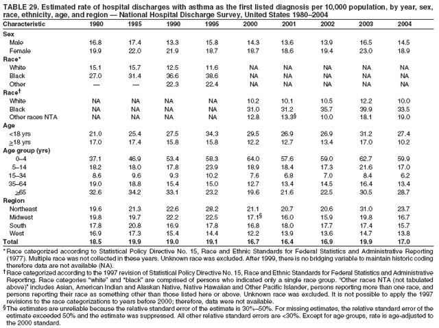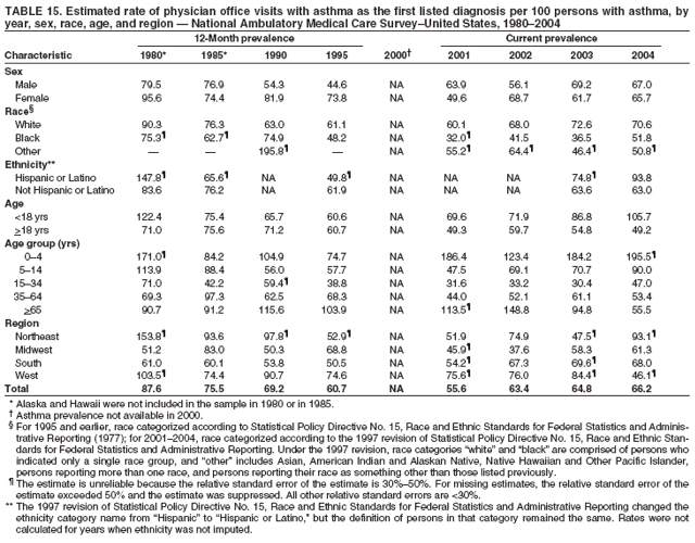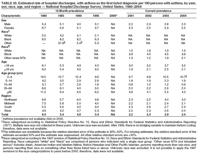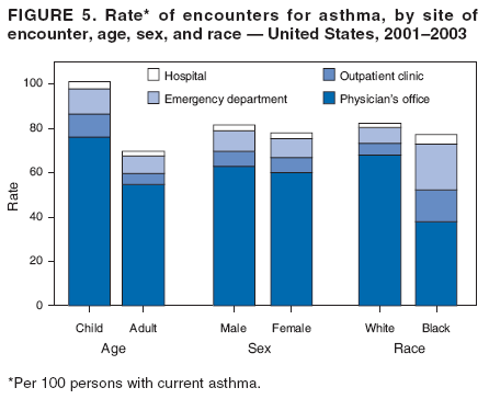Corresponding author: Jeanne E. Moorman, MS, Division of Environmental Hazards and Health Effects, National Center for Environmental Health, 1600 Clifton Road, N.E., MS E-17, Atlanta, GA 30333, Telephone: 404-498-1000; Fax: 404-498-1088; E-mail: zva9@cdc.gov. AbstractProblem/Condition: Asthma, a chronic respiratory disease with episodic symptoms, increased in prevalence during 1980--1996 in the United States. Asthma has been the focus of numerous provider interventions (e.g., improving adherence to asthma guidelines) and public health interventions during recent years. Although the etiology of asthma is unknown, adherence to medical treatment regimen and environmental management should reduce the occurrence of exacerbations and lessen the hardship of this disease. CDC has outlined a public health approach to asthma that includes comprehensive analyses of national surveillance data on prevalence, health-care use and mortality, and a strategy to improve the timeliness and geographic specificity of asthma surveillance data. Reporting Period Covered: This report presents national data on asthma for self-reported prevalence (1980--1996 and 2001--2004); self-reported attacks (1997--2004); visits to physicians' offices (1980--2004), hospital outpatient departments (1992--2004), and emergency departments (1992--2004); hospitalizations (1980--2004); and deaths (1980--2004). Description of Systems: The National Health Interview Survey includes questions about asthma prevalence and asthma attacks. Physicians' office visit data are collected in the National Ambulatory Medical Care Survey, emergency department and hospital outpatient data in the National Hospital Ambulatory Medical Care Survey, hospitalization data in the National Hospital Discharge Survey, and death data in the Mortality component of the National Vital Statistics System. Results: From 1980 to 1996, 12-month asthma prevalence increased both in counts and rates, but no discernable change was identified in asthma attack estimates since 1997 or in current asthma prevalence from 2001 to 2004. During the period of increasing prevalence, patient encounters (office visits, emergency department visits, outpatient visits, and hospitalizations) for asthma increased. However, rates for these encounters, when based on the population with asthma, did not increase. Although the rate of asthma deaths increased during 1980--1995, the rate of deaths has decreased each year since 2000. During 2001--2003, current asthma prevalence was higher in children (8.5%) compared with adults (6.7%), females (8.1%) compared with males (6.2%), blacks (9.2%) compared with whites (6.9%), those of Puerto Rican descent (14.5%) compared with those of Mexican descent (3.9%), those below the federal poverty level (10.3%) compared with those at or above the federal poverty level (6.4% to 7.9%), and those residing in the Northeast (8.1%) compared with those residing in other regions (6.7% to 7.5%). Among persons with current asthma, whites and blacks were equally likely to report an attack during the preceding 12 months. Women with current asthma were more likely to report asthma attacks than men, and children were more likely than adults. The rate for asthma health-care encounters, regardless of place (physician office, emergency department, outpatient department, or hospital), when based on the population with asthma, did not differ by race. However, whites with current asthma had higher rates for physician offices, and blacks had higher rates for hospital-based sites (e.g., outpatient clinics and emergency departments). Interpretation: The findings in this report suggest that from 1980 through the mid-1990s, increases in asthma prevalence played a substantial role in the increases in patient encounter measures used in asthma surveillance. Because no primary strategies for preventing asthma have been identified, efforts to control asthma exacerbations through interventions that promote adhering to proper medical regimens and reducing exposures to causes of asthma exacerbations should continue to be pursued. IntroductionAsthma is a chronic inflammatory disorder of the airways characterized by episodic and reversible airflow obstruction and airway hyperresponsiveness. Clinical manifestations include wheezing, coughing, and shortness of breath. Although the pathophysiology of asthma is fairly well understood, the exact etiology is not. Following medical management guidelines and avoiding exposure to environmental allergens and irritants that are known to exacerbate asthma are factors that can contribute to the long-term management of asthma. The specific measures used to assess asthma morbidity and mortality have changed since the 1960s; however, the findings of previous studies are consistent with an increase in asthma burden (1--3). Estimates of asthma 12-month period prevalence* indicated that approximately 3.0% of the population had asthma in 1970 (1). Estimates from CDC's 2002 Asthma Surveillance Summary indicated that asthma 12-month period prevalence was 5.5% in 1996 (3). Asthma mortality rates increased during 1979--1996, but not during 1996--1998. From 1979 through 1998, deaths were categorized using the International Classification of Diseases, Ninth Revision (ICD-9) (4). The tenth revision (ICD-10) was implemented in 1999 (5) after which asthma mortality rates declined. Part of the decline was a result of the coding change. Information on the burden of asthma is provided from self-reported asthma episodes or attacks, physician office visits or hospital outpatient visits, emergency department visits, and hospital inpatient stays. Expressed as population-based rates, each of the measures used in the 2002 Surveillance Summary indicated either increasing or stable asthma burden, at least through the 1990s (3). A 1987 report that included asthma surveillance data for 1965--1984 identified a disparate burden in certain demographic subgroups (age, sex, and race) (1). Sub