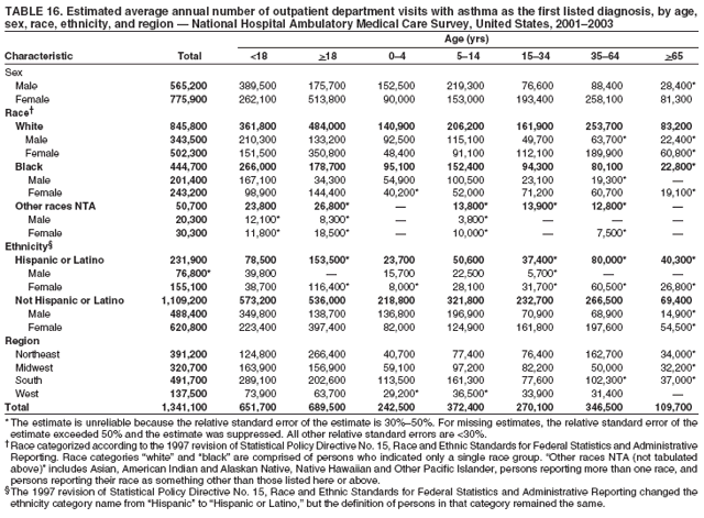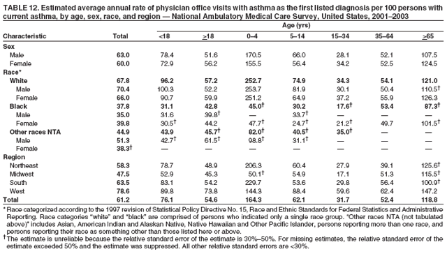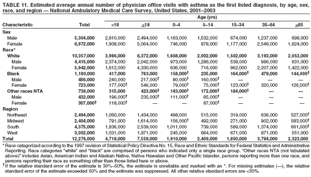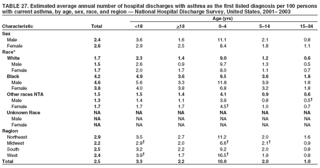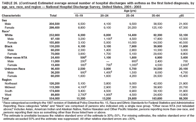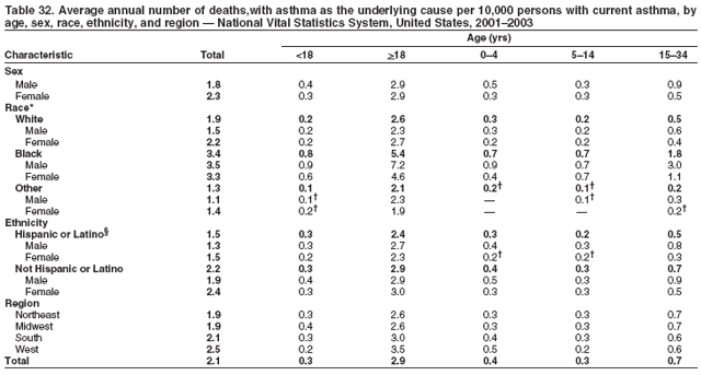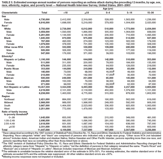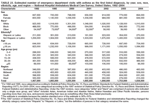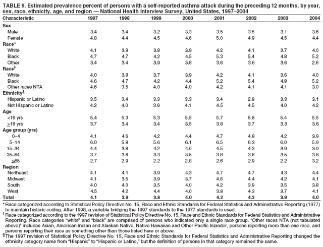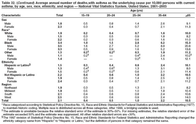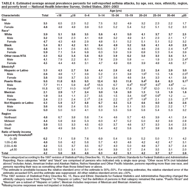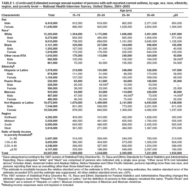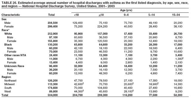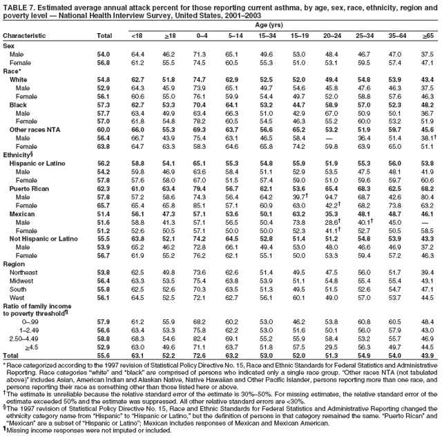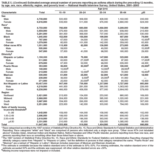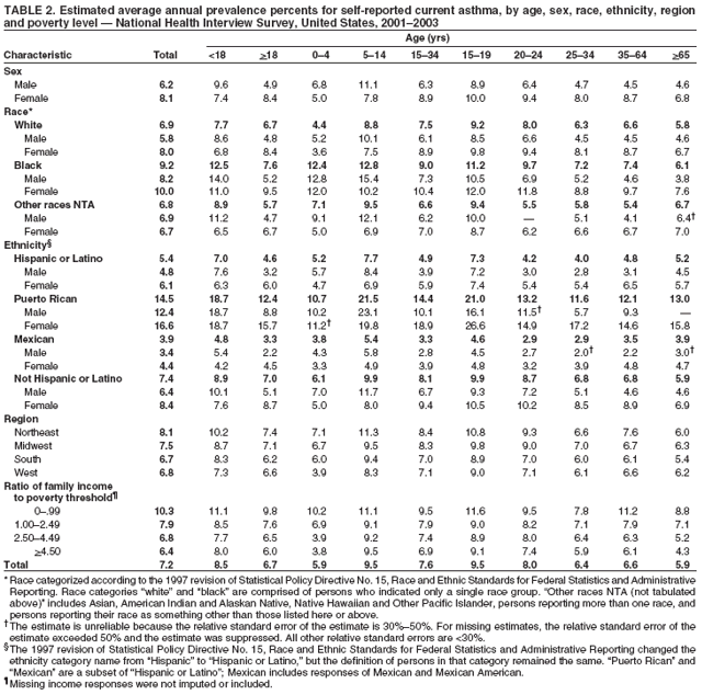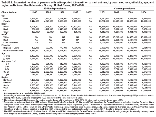 * Period prevalence is the prevalence of a disease over a duration of time. During 1980--1996, 12-month asthma prevalence was determined by an affirmative response to the question, "During the past 12 months has anyone in the family had asthma?" Each of the national health surveys and NVSS can be accessed at http://www.cdc.gov/nchs/express.htm. § School and work days lost because of asthma are not included in this report because of changes in the survey questions that make the results incomparable to the 2002 Surveillance Summary. ¶ Categorization of states in regions is available at http://www.census.gov/geo/www/us_regdiv.pdf. Table 1![]() ![]() Return to top. Figure 1 ![]() Return to top. Table 2 ![]() Return to top. Figure 2 ![]() Return to top. Table 3 ![]() Return to top. Figure 3 ![]() Return to top. Table 4 ![]() Return to top. Figure 4 ![]() Return to top. Table 5 ![]() ![]() Return to top. Figure 5 ![]() Return to top. Table 6 ![]() Return to top. Table 7 ![]() Return to top. Table 8 ![]() Return to top. Table 9 ![]() Return to top. Table 10 ![]() Return to top. Table 11 ![]() Return to top. Table 12 ![]() Return to top. Table 13 ![]() Return to top. Table 14 ![]() Return to top. Table 15 ![]() Return to top. Table 16 ![]() Return to top. Table 17 ![]() Return to top. Table 18 ![]() Return to top. Table 19 ![]() Return to top. Table 20 ![]() Return to top. Table 21 ![]() ![]() Return to top. Table 22 ![]() Return to top. Table 23 ![]() Return to top. Table 24 ![]() Return to top. Table 25 ![]() Return to top. Table 26 ![]() ![]() Return to top. Table 27 ![]() ![]() Return to top. Table 28 ![]() Return to top. Table 29 ![]() Return to top. Table 30 ![]() Return to top. Table 31 ![]() ![]() Return to top. Table 32 ![]() ![]() Return to top. Table 33 ![]() Return to top. Table 34 ![]() Return to top. Table 35 ![]() Return to top.