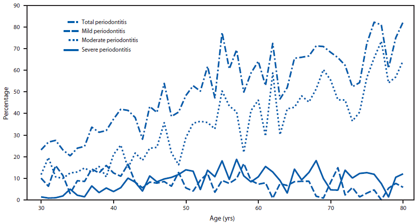 During 2009–2010, an estimated 47.2% of adults aged ≥30 years in the United States had periodontitis (Table 1). The prevalence of total and moderate periodontitis increased with increasing age among all adults. However, the prevalence of mild and severe periodontitis remained relatively steady at <15% across all age groups (Figure).