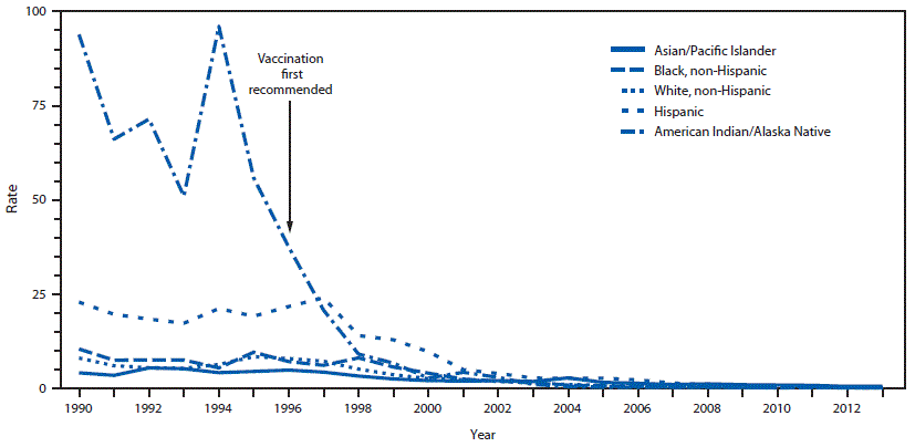 To control HAV infection, CDC’s Advisory Committee on Immunization Practices (ACIP) developed recommendations for hepatitis A (HepA) vaccination incrementally in 1996, 1999, and 2006. Initially, persons living in areas experiencing community outbreaks and high rates of infection were targeted for vaccination, and eventually universal childhood HepA vaccination was recommended (3,6,18). This report describes the HepA vaccination program in the United States, its impact on elimination of disparities (on the absolute scale) in the incidence of HAV disease, and new challenges posed by disparities in HAV seroprotection.